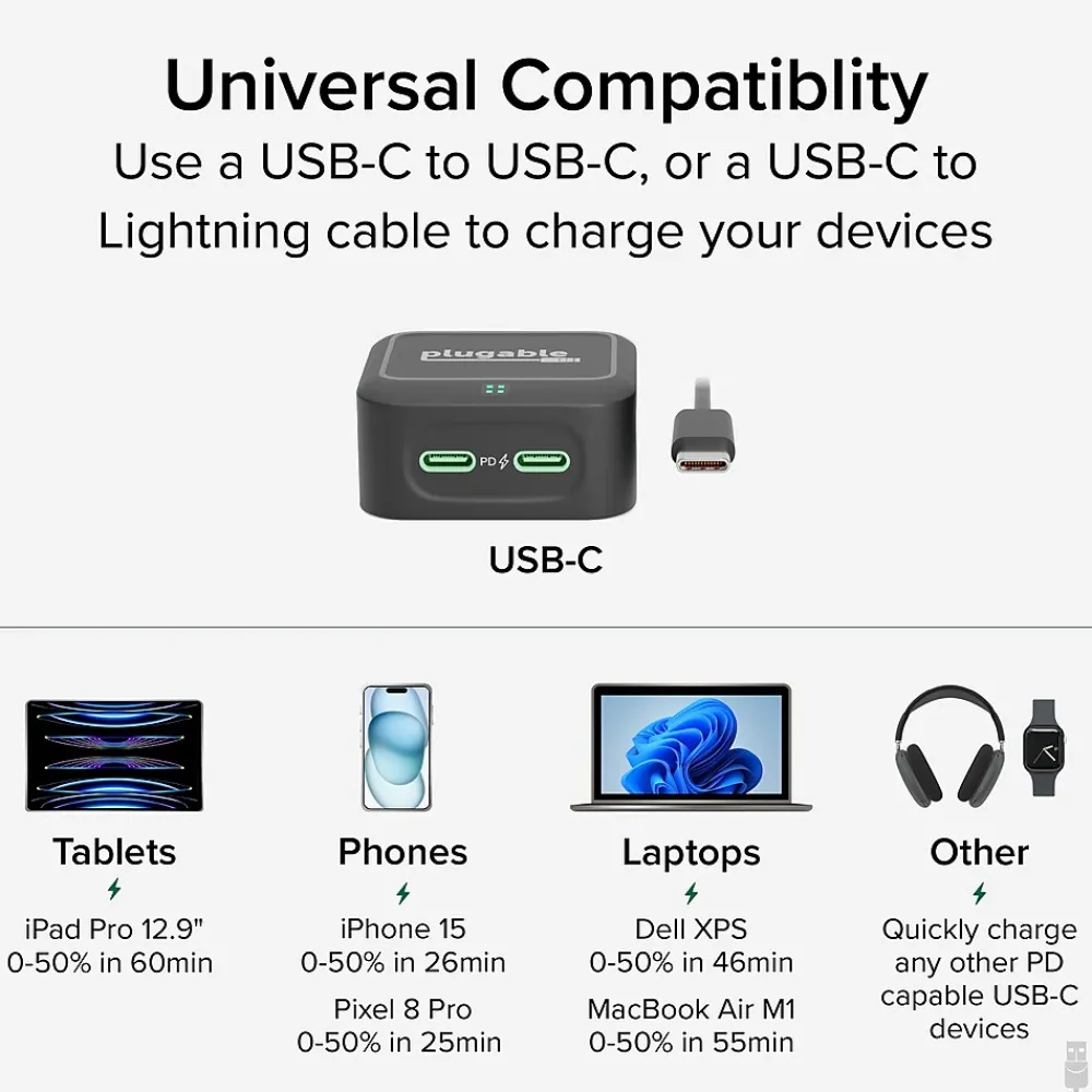 - Works With – Fast, safe USB C wall charger for Thunderbolt, USB4, USB-C, and Lightning phones like Samsung Galaxy S24 series, Pixel 8/Pro, iPhone 15, and tablets like Samsung Galaxy Tab S9 FE+, iPad, iPad Pro, and iPad Mini, in a pinch, it can be used to charge a laptop