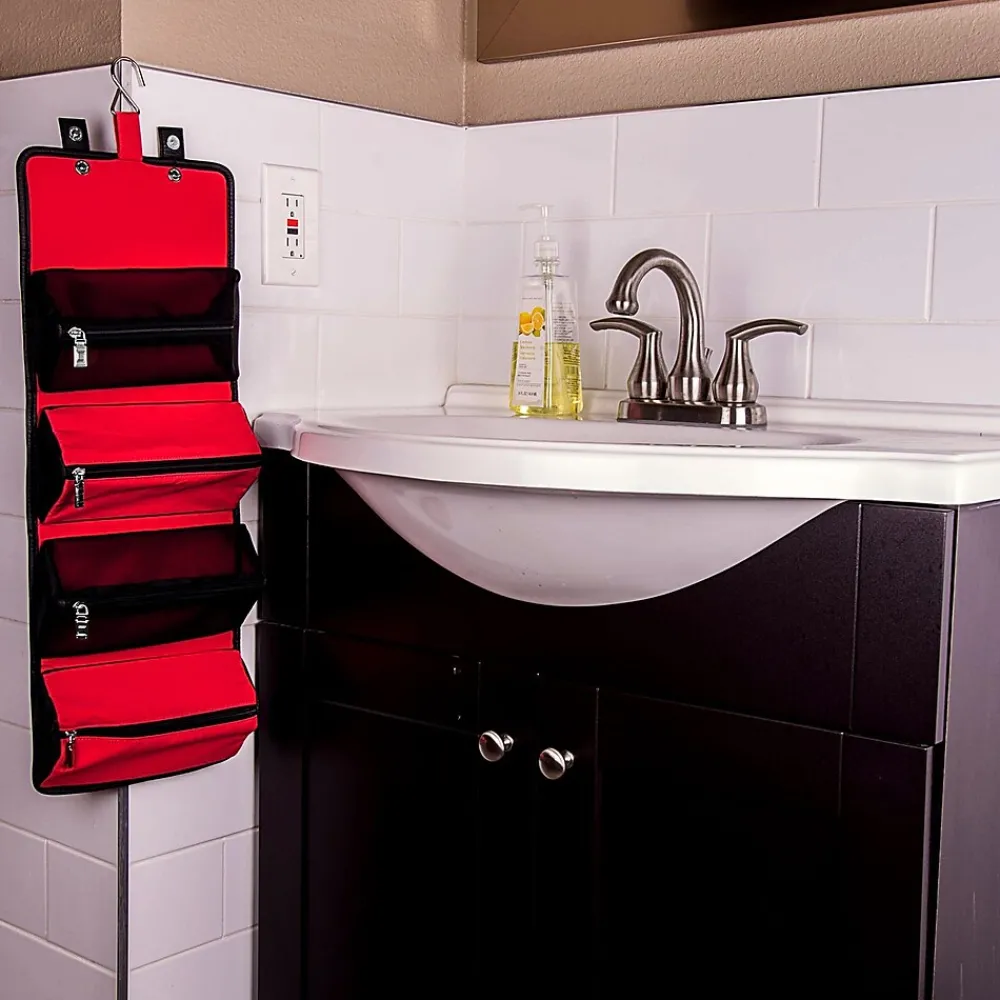 The Stowaway makes organizing a simple process. Use it for multiple end uses: travel, toiletry storage, makeup kit, cable and tech organizer, etc. Unrolling the Stowaway unveils the organizer pouches. Each pouch is removable and the exterior cover can be folded or placed flat when transporting inside other luggage. Equipped with a metal hook, the Stowaway can be hung upright. Weather resistant