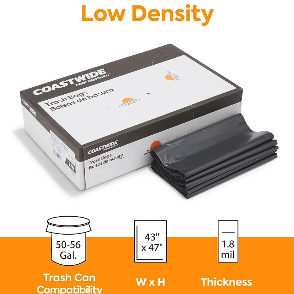 Enjoy versatility and efficiency with these low-density trash bags. Manufactured with prime resin, these garbage bags offer durability to handle large-scale cleanup tasks. The 56-gallon capacity and 1.8-mil thickness help contain liquids and prevent rubbish from poking through. A star-sealed bottom distributes refuse evenly for simple lifting and carrying. Boasting a top-side dual dispenser, these Coastwide Professional™ trash bags store vertically or horizontally for easy dispensing.