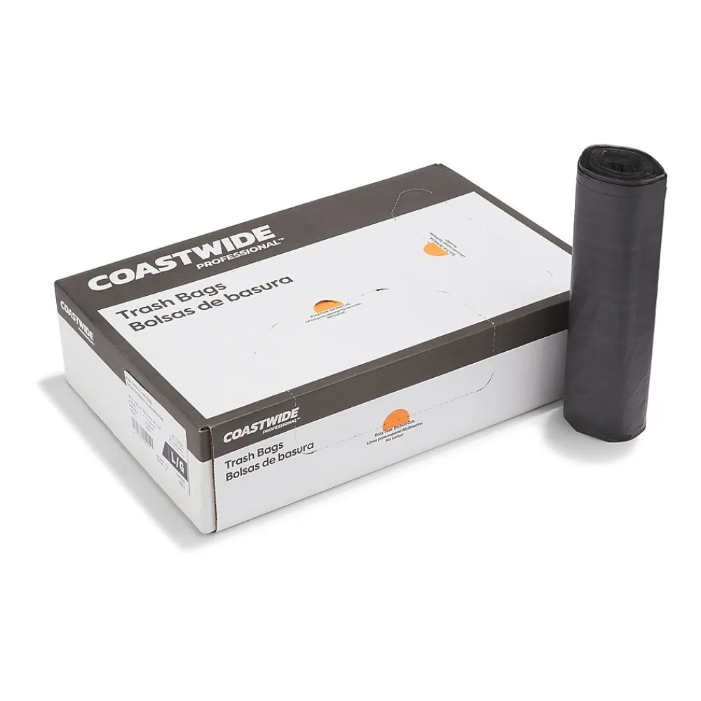 Employ simple storage and cleanup with these high-density trash bags. Strong and durable, these bags keep rubbish and wet objects inside the liner. A star-sealed bottom conforms to the bin’s shape and settles the contents, so you can slip the bag out of the can without ruptures or leaks. These Coastwide Professional™ trash bags feature a dual opening for horizontal or vertical storage and access.