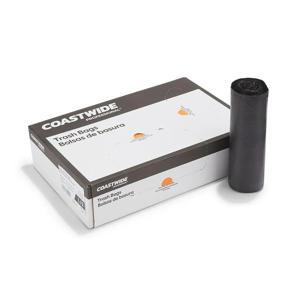 Reduce the risk of spills around your break room, cafeteria or other shared space with these reprocessed resin trash bags. The star-sealed bottom distributes weight evenly to prevent leaks or tears, while the black material conceals the content to ensure discretion. Boasting a 55 to 60-gallon capacity, these Coastwide Professional™ trash bags have plenty of room, making them suitable for busy environments, and come in a carton of 100 to provide an ample supply.