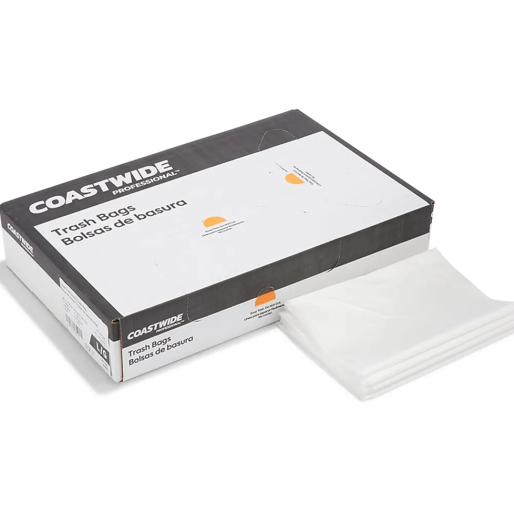 Prevent theft and accidental disposal with these trash bags. The low-density polyethylene material offers lasting durability and lets you dispose of heavy or sharp items without stretching or tearing. A transparent design makes identifying contents easy, which is ideal for preventing theft. Boasting a capacity of 55 to 60 gallons, these Coastwide Professional™ clear low-density trash bags fit easily in large receptacles and provide ample space for disposing of waste.