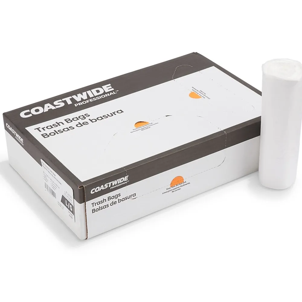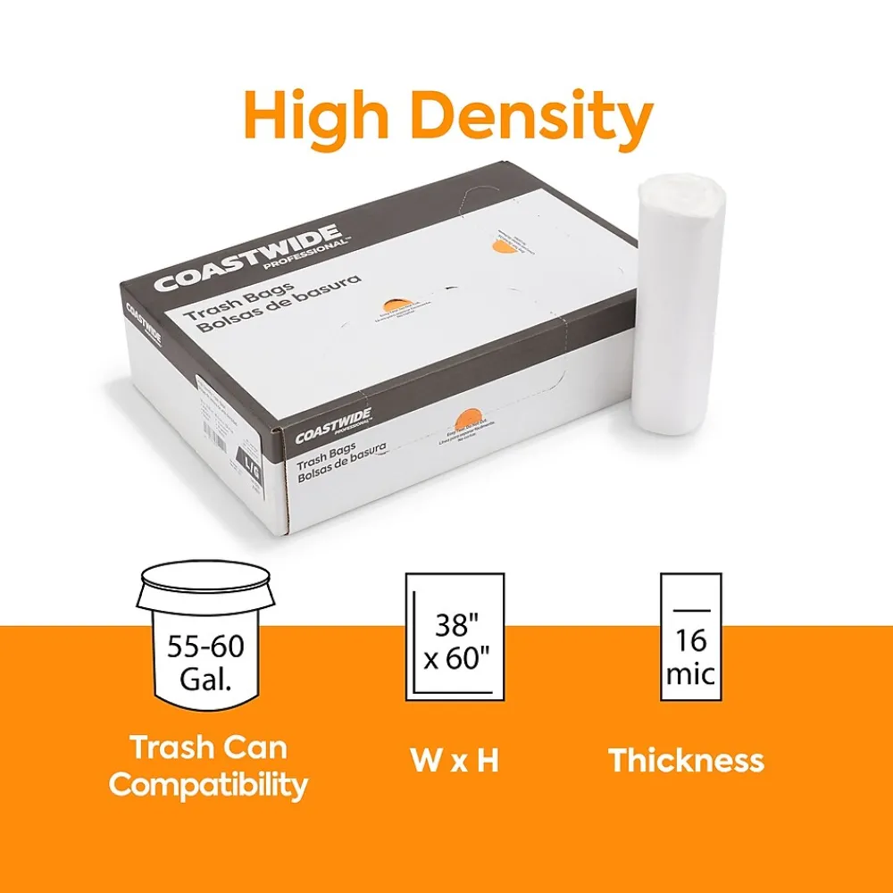 Store rubbish inside these durable trash bags. The star-sealed bottom prevents wet trash from leaking out, and the high-density material makes the bags stronger and handle higher loads. Natural coloring lets you view items and reduce the chance of theft before placing them in the trash compactor. These Coastwide Professional™ trash bags hold up to 60 gallons of waste, making them a practical choice for managing large jobs.