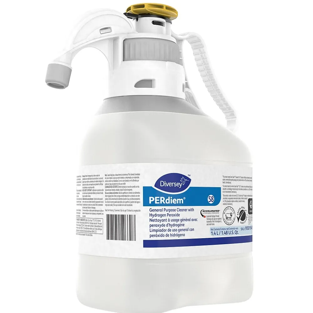 Pre-treat carpets with this hydrogen peroxide-based general-purpose cleaner to remove stubborn stains and ground-in dirt. The SmartDose system delivers accurate, safe and effective dilutions at 1:64, 1:128 and 1:256 for most hard floors and an array of surfaces, including glass and marble. This Perdiem cleaner features germ-killing hydrogen peroxide, providing an ideal solution for restaurants, health care facilities, and schools.