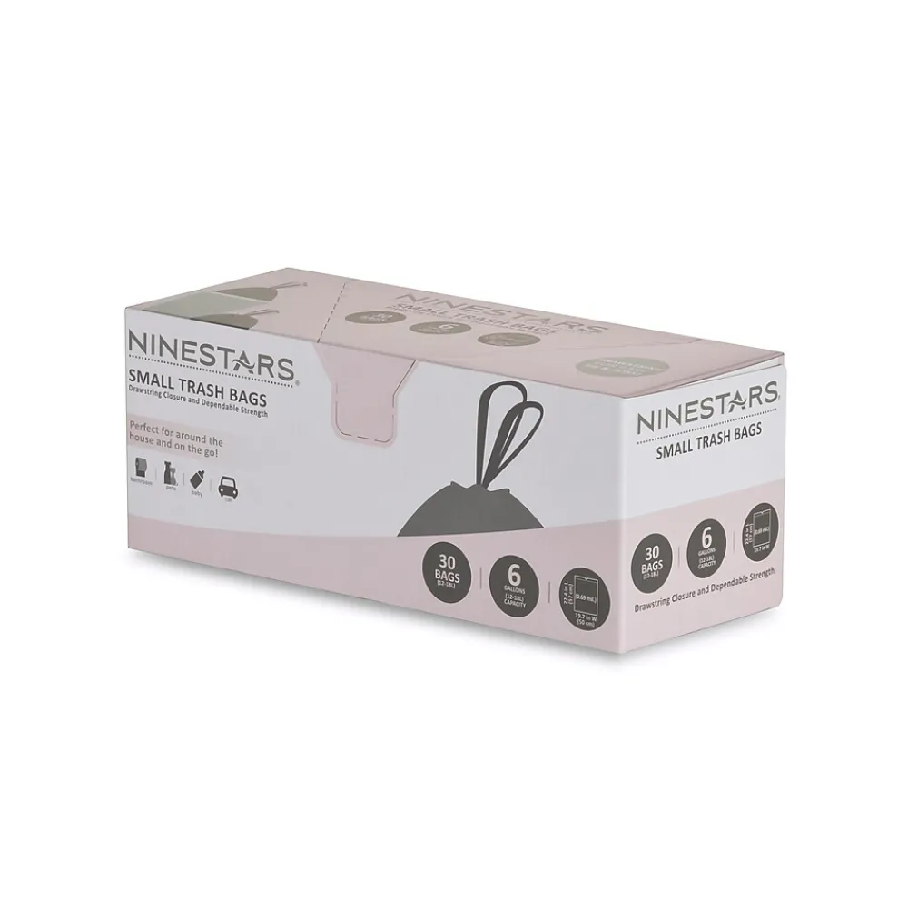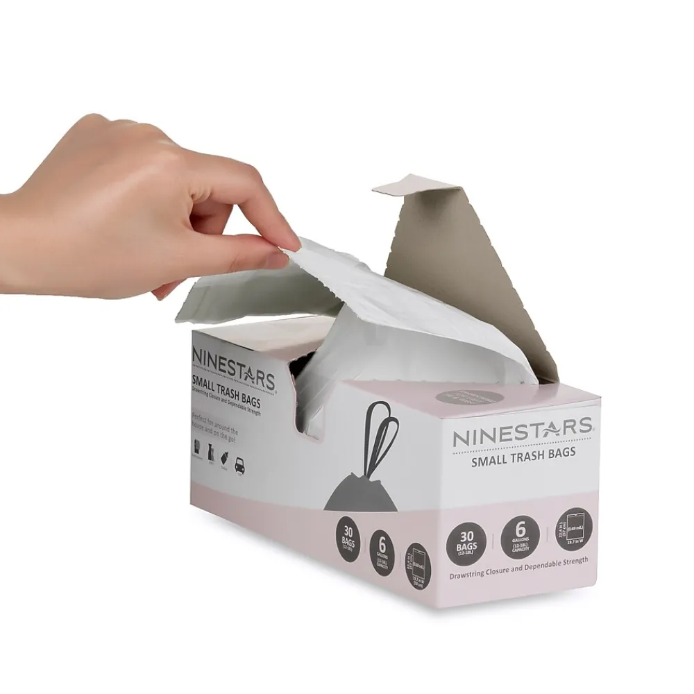 Nine Stars 6 gallons/12-18 liter white trash bag with drawstring closure. 30 count in a box. Trash bag dimensions: 22.4″x 19.7″ x 0.69″. Drawstring closure seals the garbage smell and makes bag easy to close and carry. Strong layer helps protect against leaks. Great for kitchen, bathroom, and bedroom trash cans.