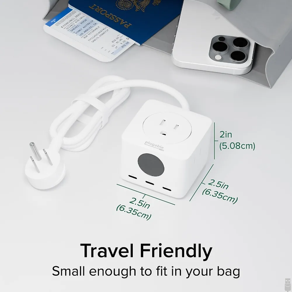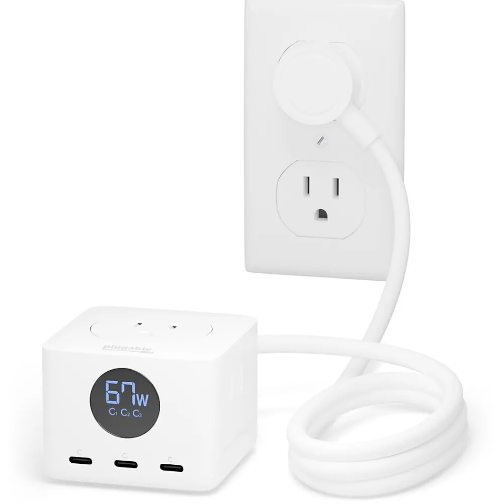 - Powerful charging – Charge everything with Plugable’s Triple Charging Station, an extension cord with multiple outlets. 3x USB-C ports with LED display, 3x power outlet, short circuit, overvoltage, and overcurrent protection. A right-angled AC plug, and a cable tie for convenience