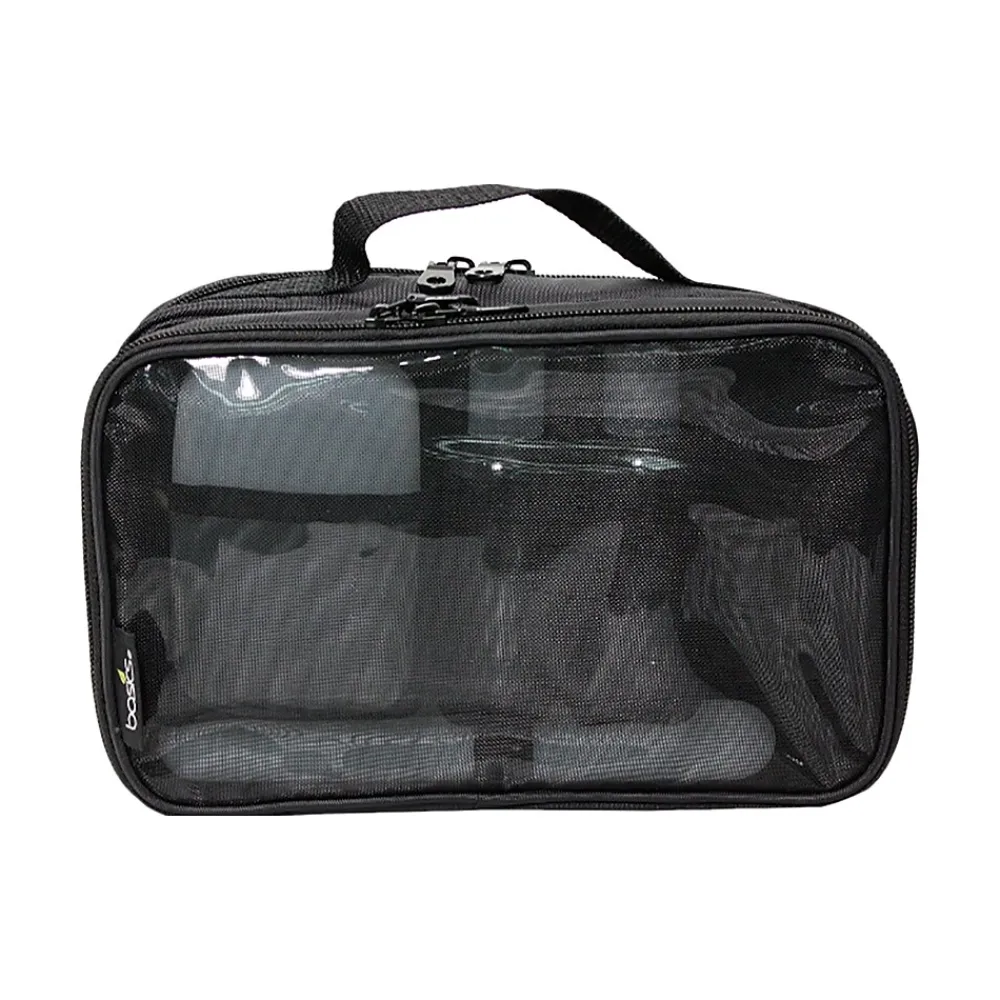 Lightweight and elegant, with an on-trend black design, this Basics fitted athletic kit makes a stylish statement and keeps all your essentials organized and accessible. The hanging caddy is removable for convenient packing and unpacking and comes with two travel bottles, a plastic soap case, and a plastic toothbrush case. The sturdy top handle makes the kit easy to carry, and the coil zipper with metal pullers keeps it securely closed. Fully lined and wipeable for easy cleaning, this athletic kit is perfect for the gym or anywhere you need to stay on top of your game.
