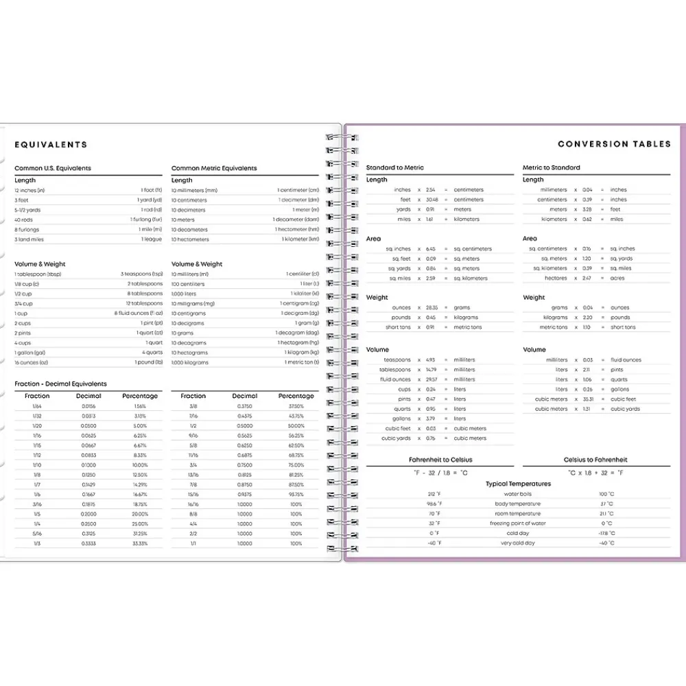- Features one month per two pages and one week per two pages, with space for notes and quick reference calendars