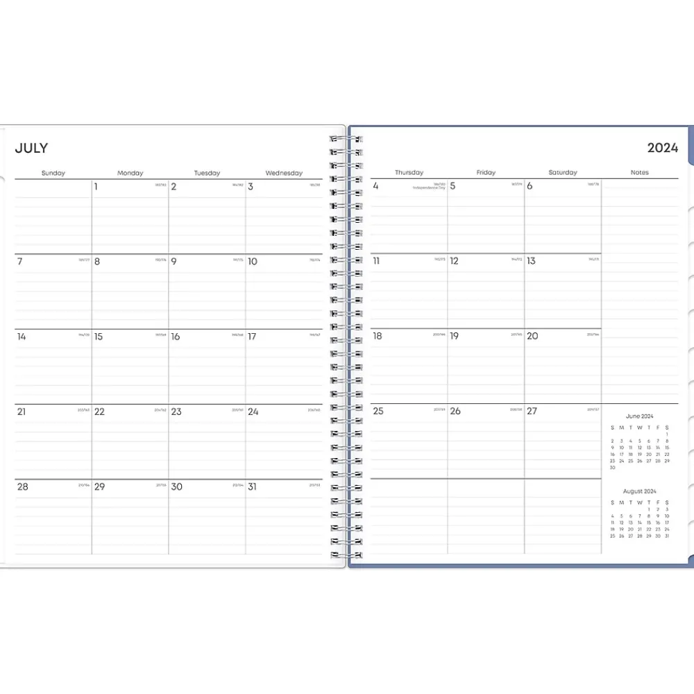 - Features one month per two pages and one week per two pages, with space for notes and quick reference calendars