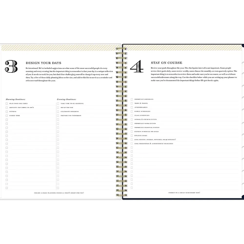 - Features one month per two pages and one week per two pages, with four-step guide to goal setting, two-year reference calendar, weekly quotes, and space for notes