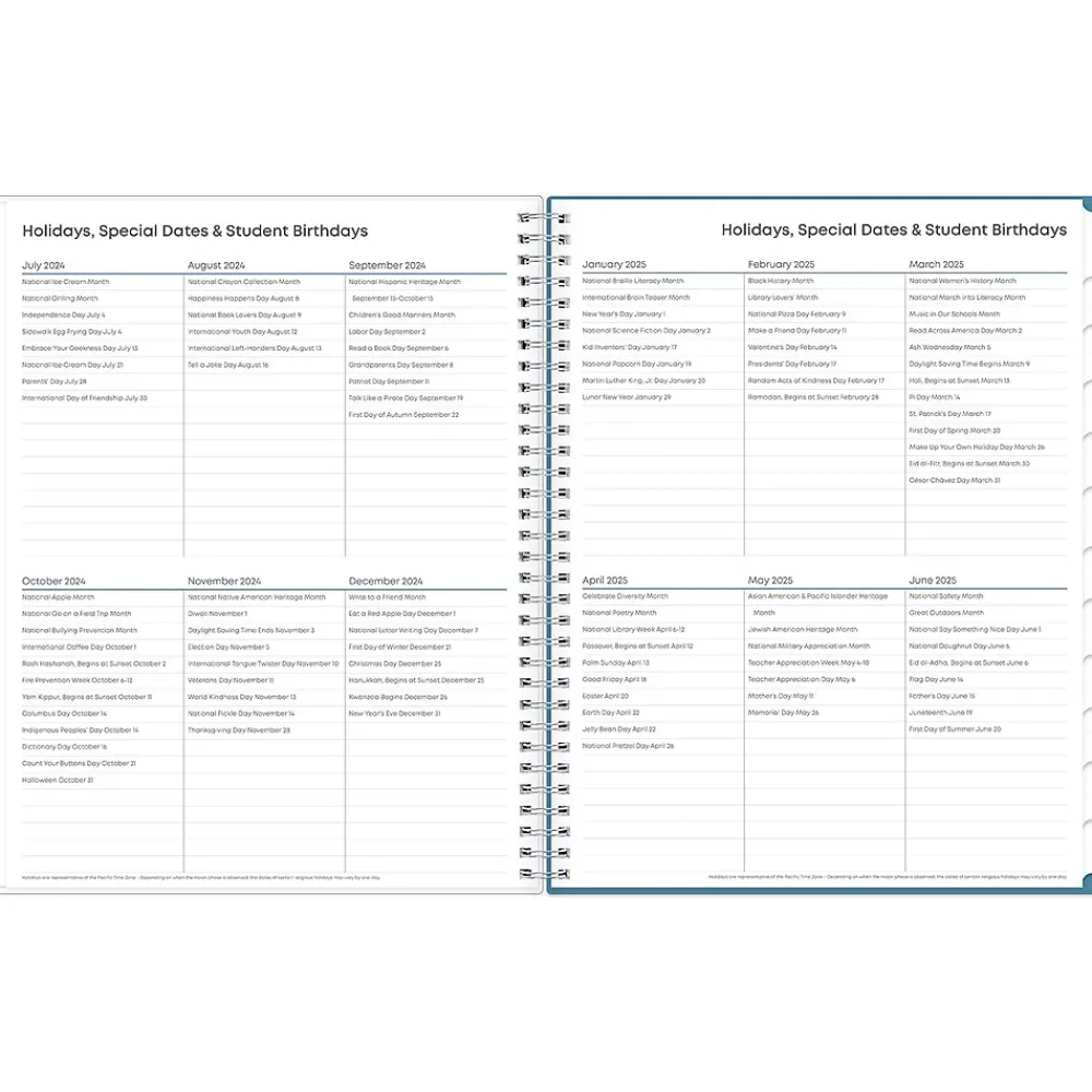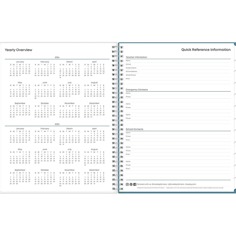 Blue Sky Teacher lesson planners keep you focused and organized. The Ditsy Dapple Light teacher planner has weekly planning space for up to nine classes or subjects. Monthly pages are tabbed and offer plenty of room for notes. Extras include a storage pocket and pages for weekly activities, class birthdays, and holidays.