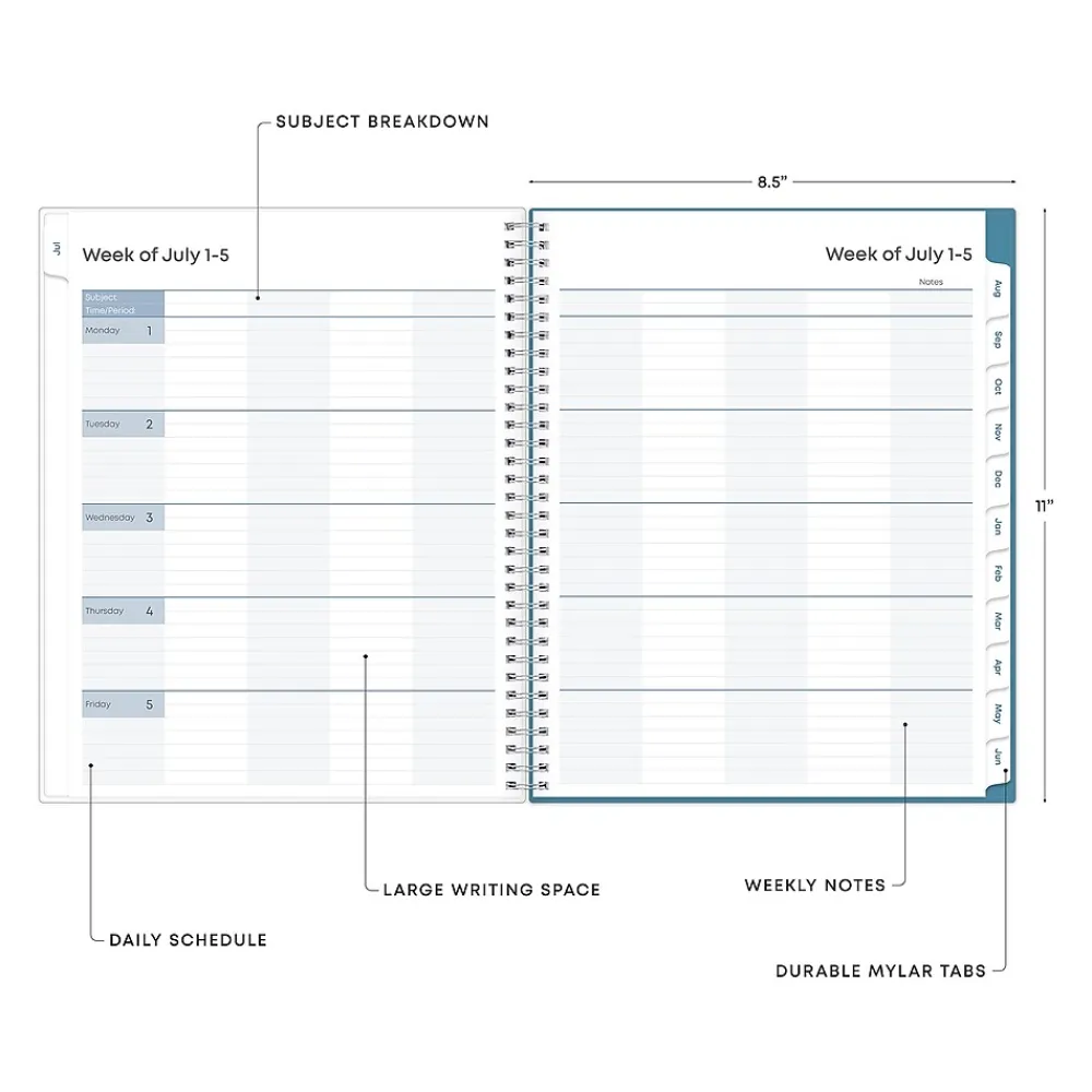 - Weekly spreads with planning space for up to nine classes or subjects; monthly pages are tabbed and offer plenty of room for notes