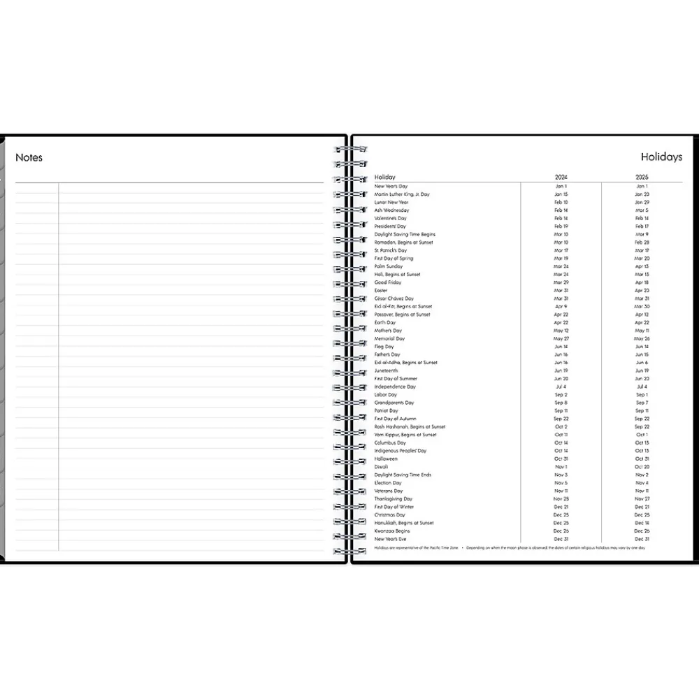 - Offers one month per two pages with space for notes and quick reference calendars