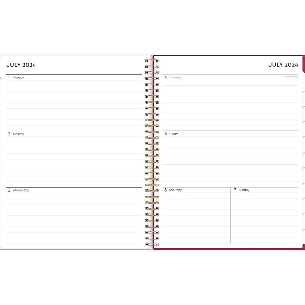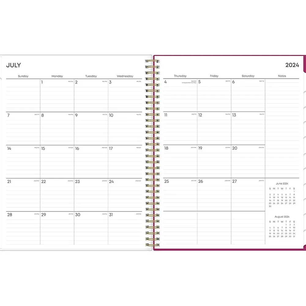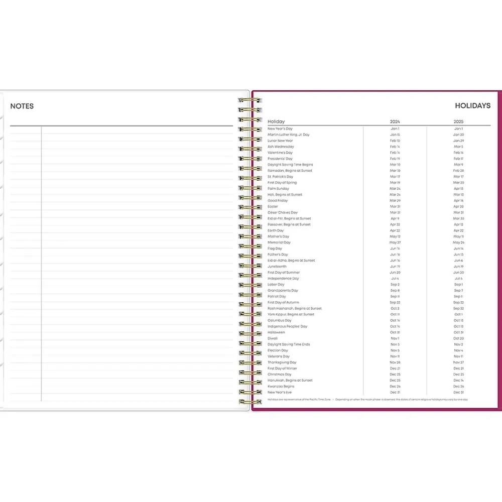 - Offers one month per two pages and one week per two pages, with space for notes and quick reference calendars