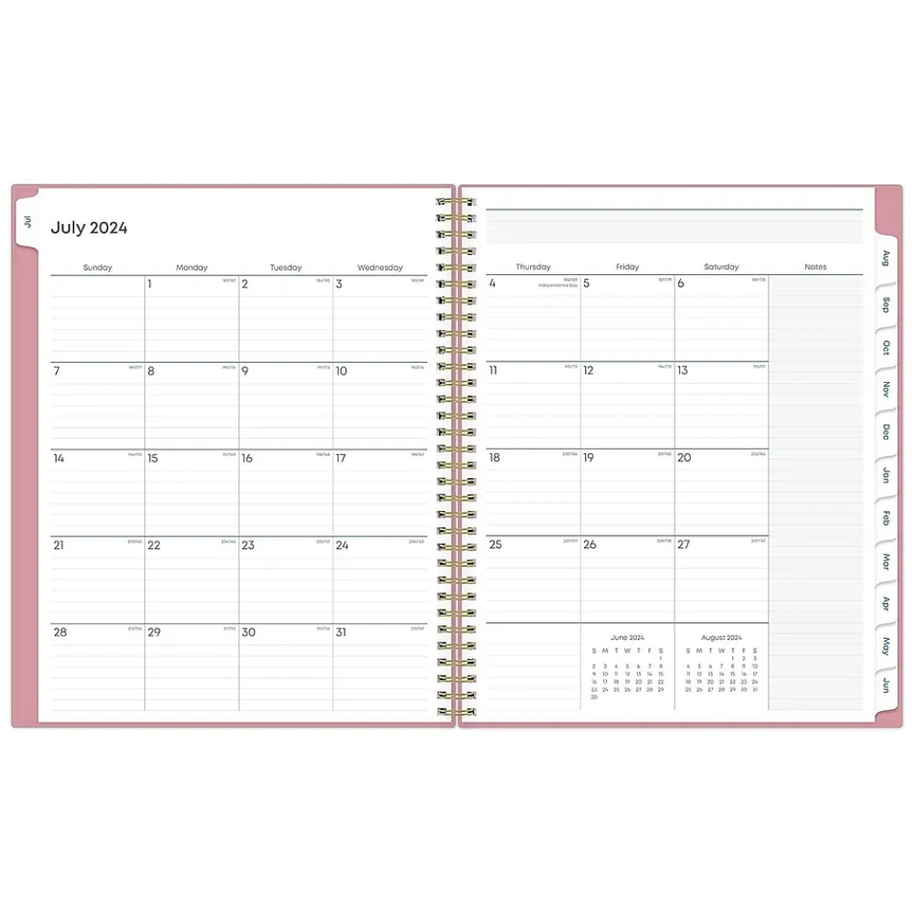 - Features one month per two pages and one week per two pages, with space for notes and quick reference calendars