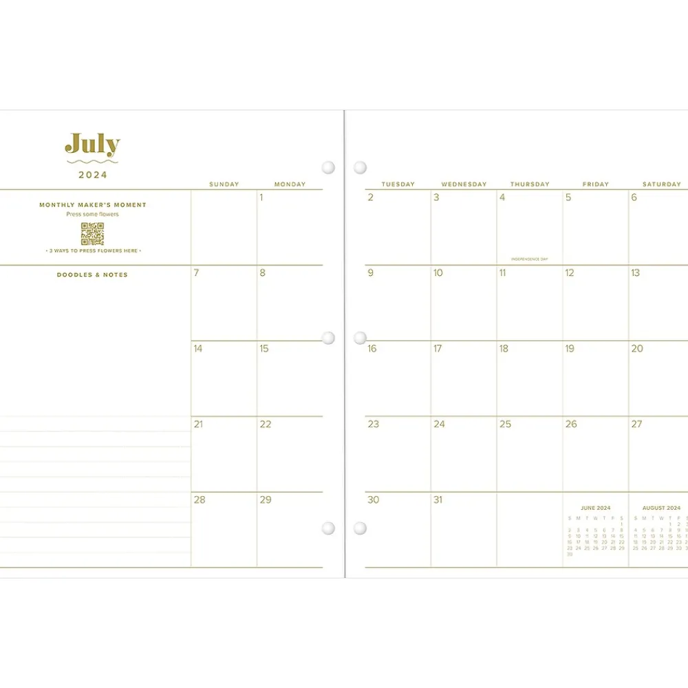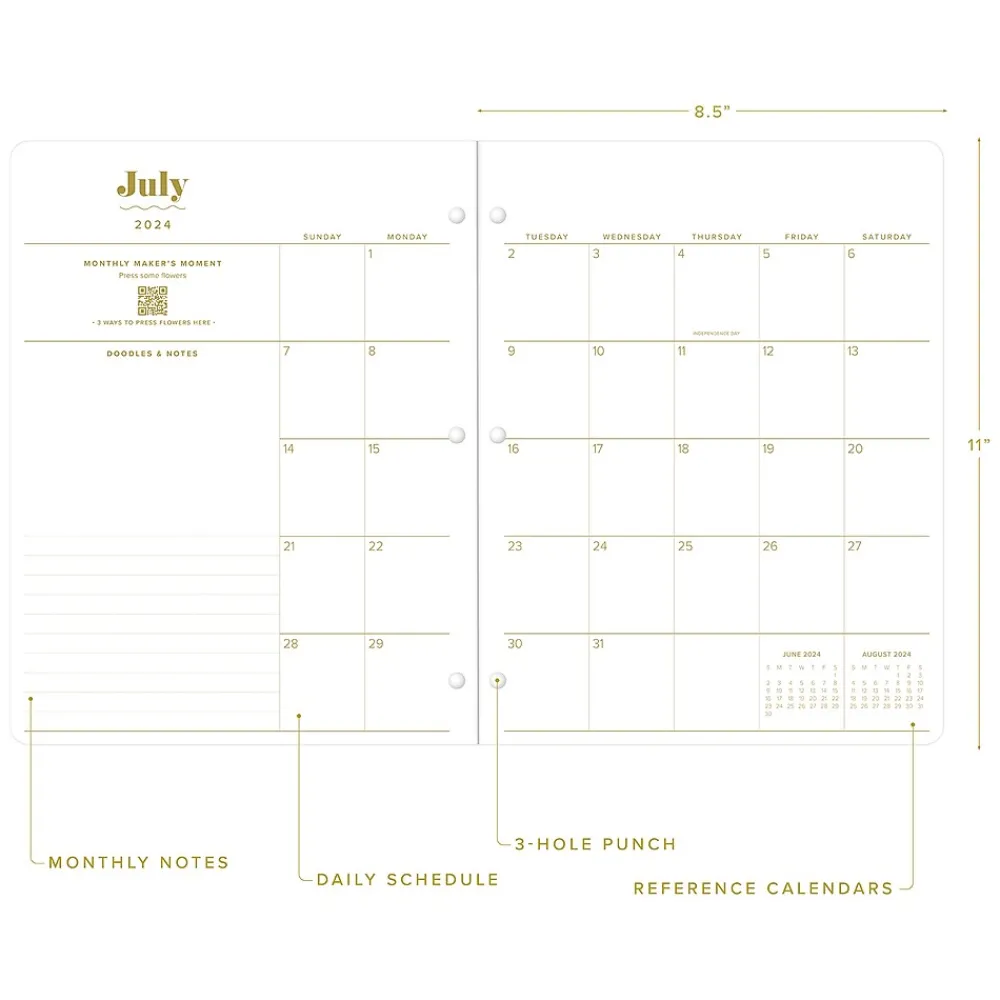 - Monthly academic planner covers a 12-month date range from July 2024 to June 2025