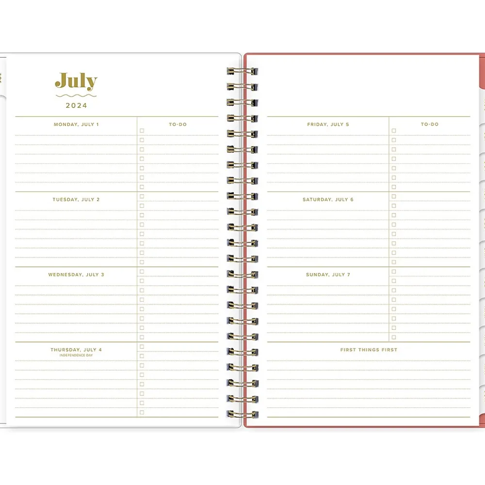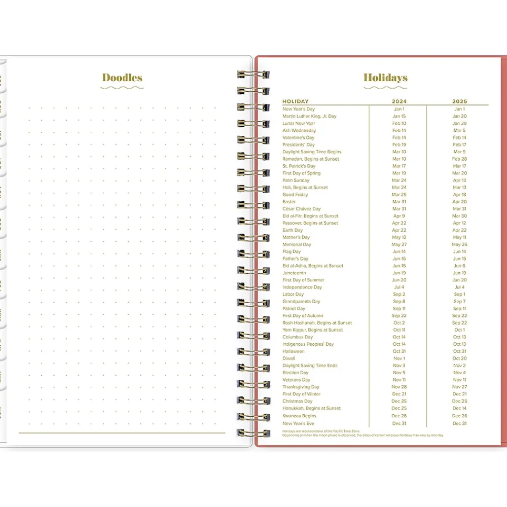 - One week per view, one month per view, notes pages and reference calendars, contacts, goals, holidays, and important dates
