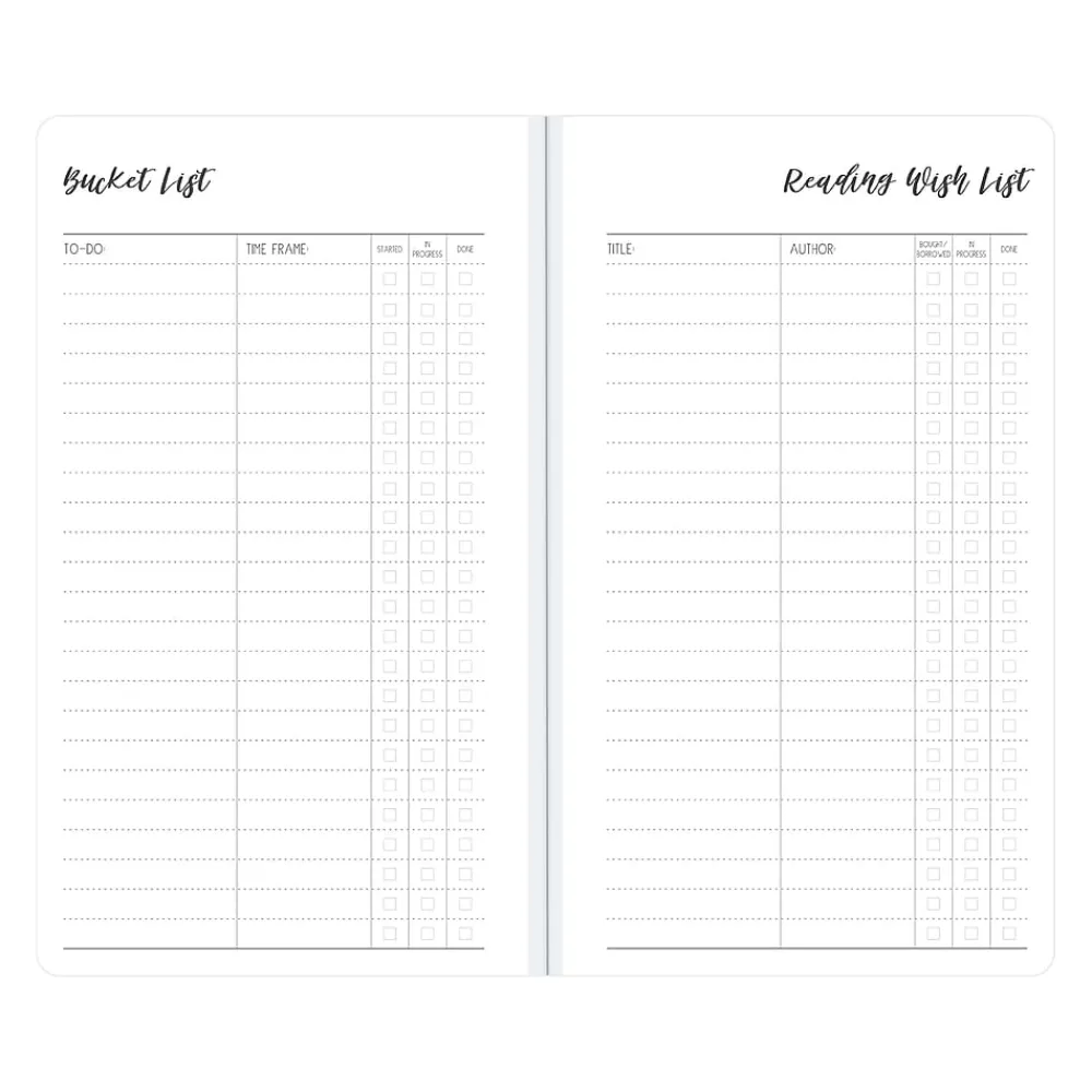 - Includes reading wish list, bucket list, and gratitude pages