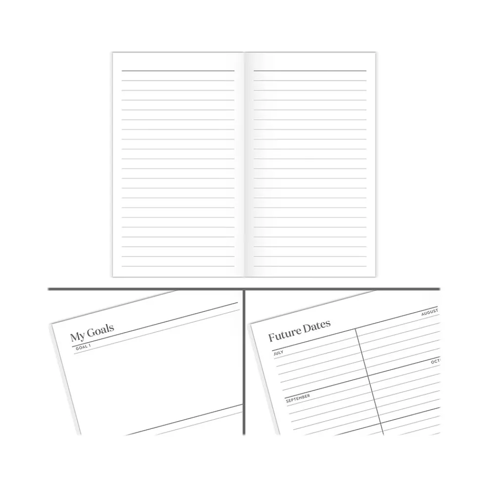 - Special pages include two pages for goals, 10 note-taking pages, future dates, and a holiday list