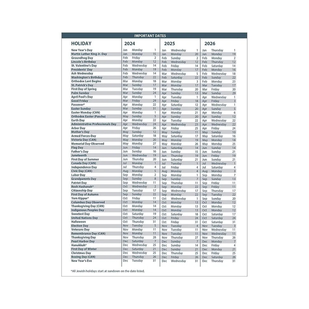- One month per two-page spread, 1.75″ x 1.75″ daily blocks, space for notes, 3-year holiday calendar, marked previous/next year months, Julian dates, and 3-year reference calendar