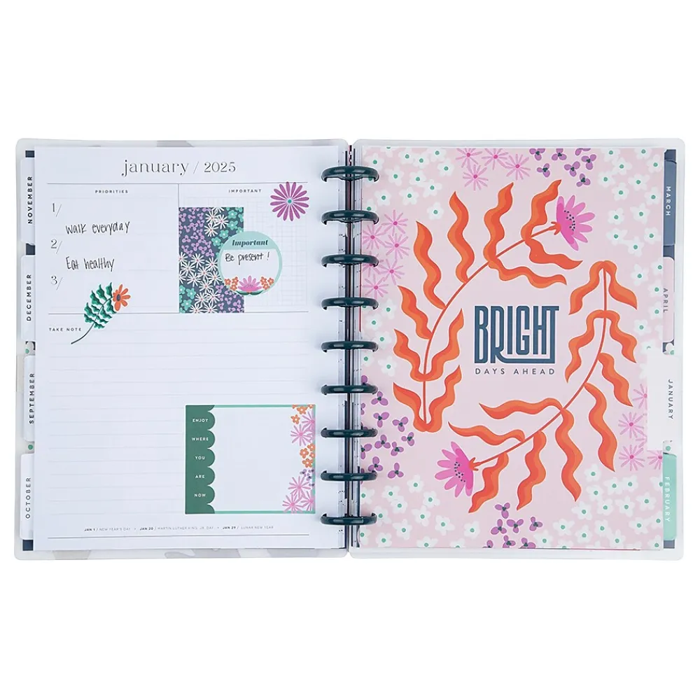 Focus on the bright side of life. Get on top of your plans from one year to the next with this July 2024 to June 2025 Abstract Florals The Happy Planner. This monthly planner contains 12 dividers featuring bright botanical accents with a 70s vibe. Customize your organization with a planner experience personalized to you. Be authentically you.