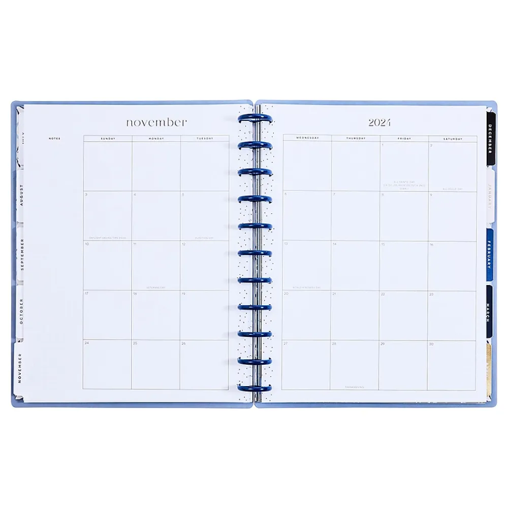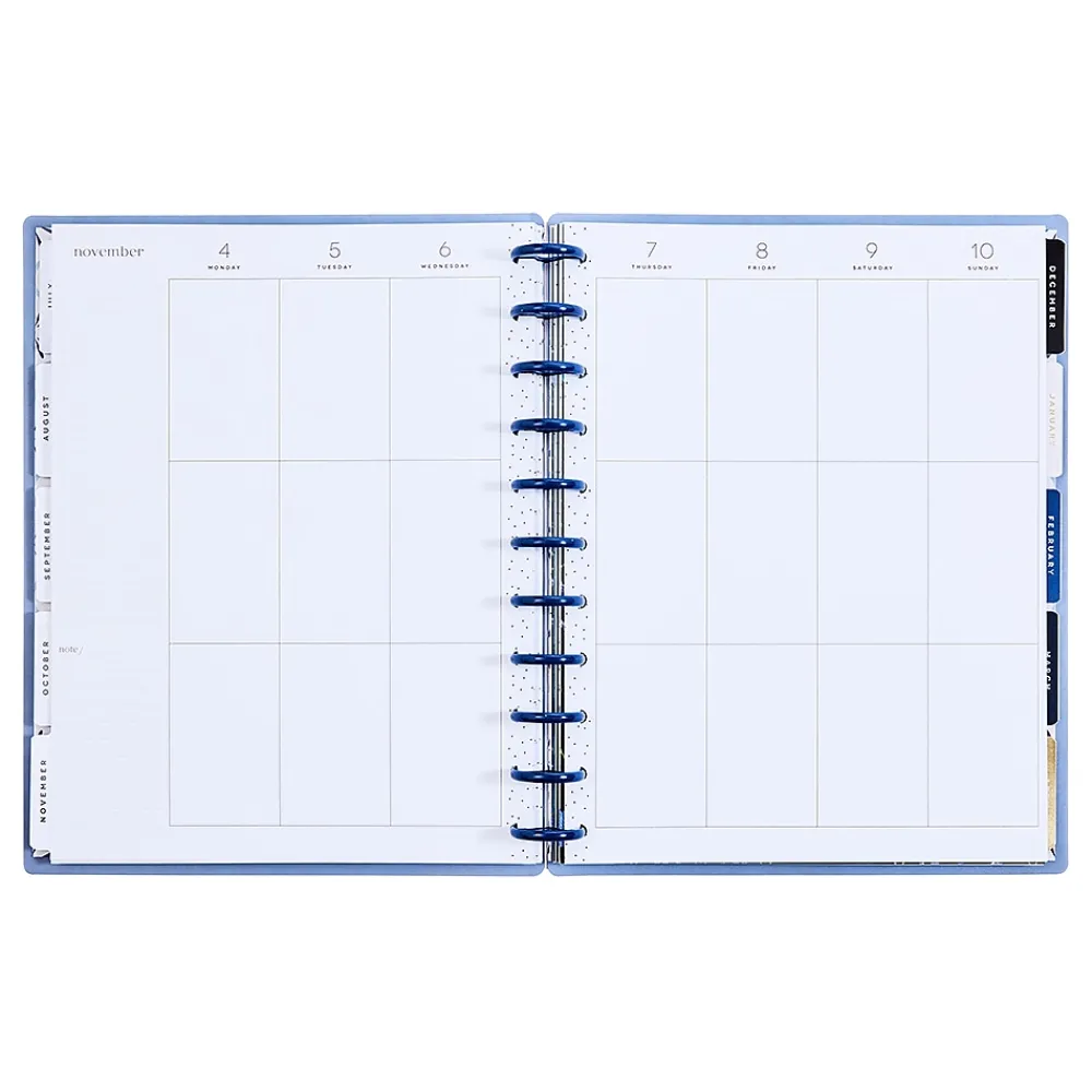 - Features dated two-page monthly and weekly spreads; the vertical layout on the weekly spreads includes three daily boxed spaces that can be divided into morning, afternoon and evening, or between work, school, and personal activities