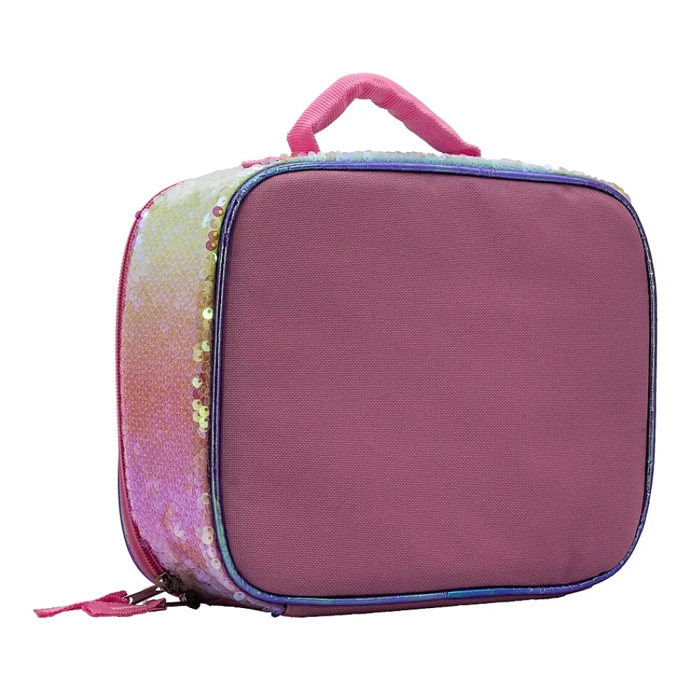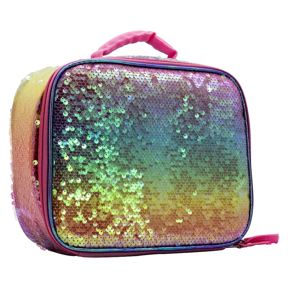 This adorable Accessory Innovations Rainbow lunch box is perfect for back to school and beyond. This supercute lunch box is made of durable polyester in pink, with the front adorned with sequins creating an ombre Rainbow design. The box offers a large main zip-around compartment with plenty of room for sandwiches, drinks, snacks, etc. Fully insulated with waterproof lining and has a padded carrying handle for comfort.