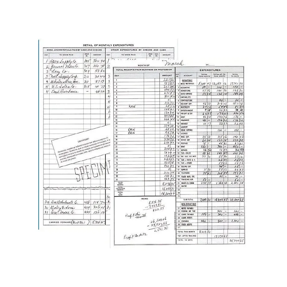 - Contains payroll section, calendar of tax forms, complete specimen page