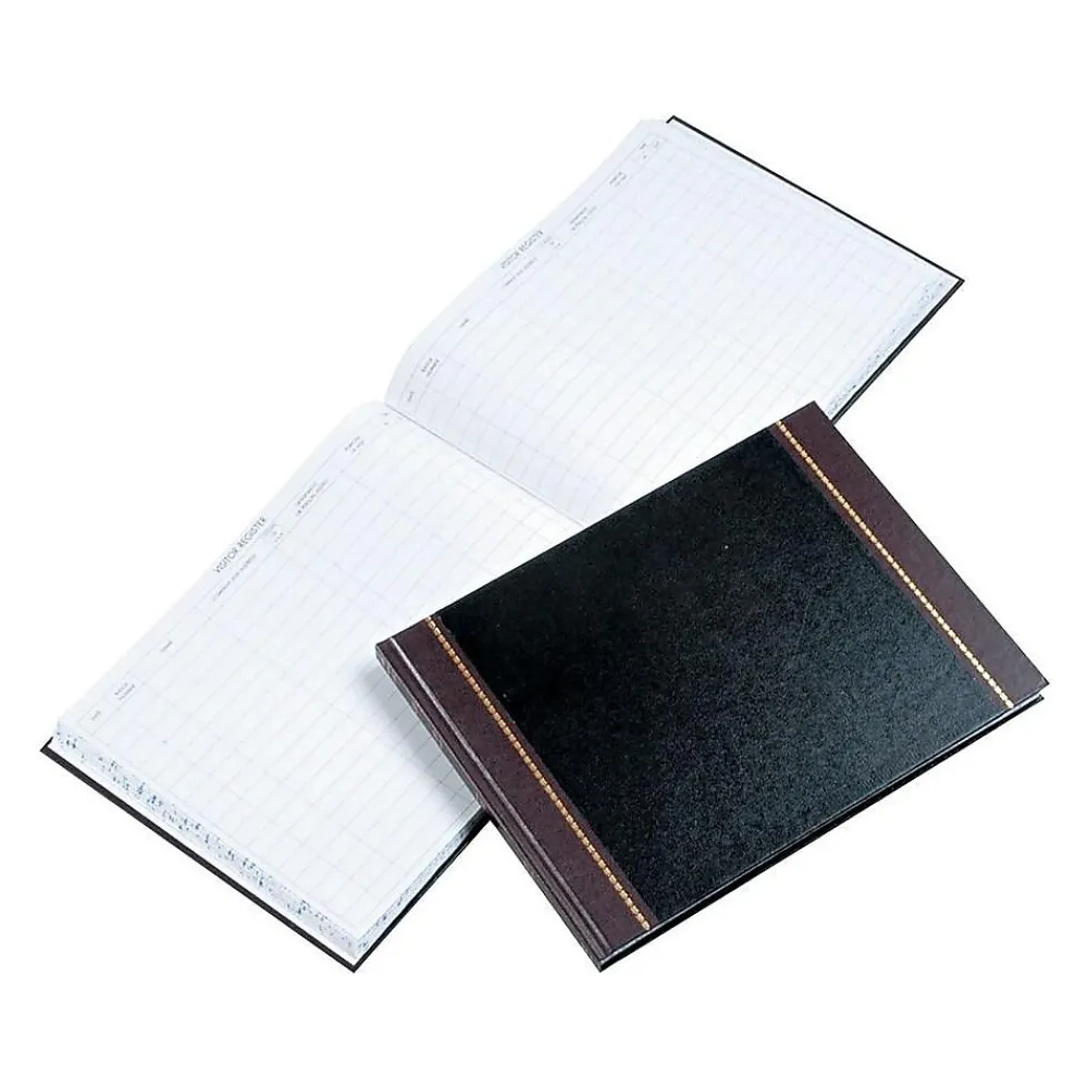 Provide an accurate list of visitors using this log book, which has space for 3,400 entries. The black cover with brown trim and gold foil stamps is durable and stylish, and the 208 pages have columns that include the date, name, time in/out, company/address, and purpose of visit. This Wilson Jones register book is ideal for security purposes and useful during emergency evacuations.