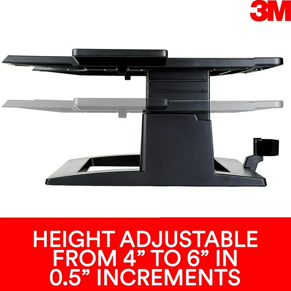 Height adjustable from 4 in to 6 in in 0.5 in increments. Slots in platform help keep laptop ventilated.