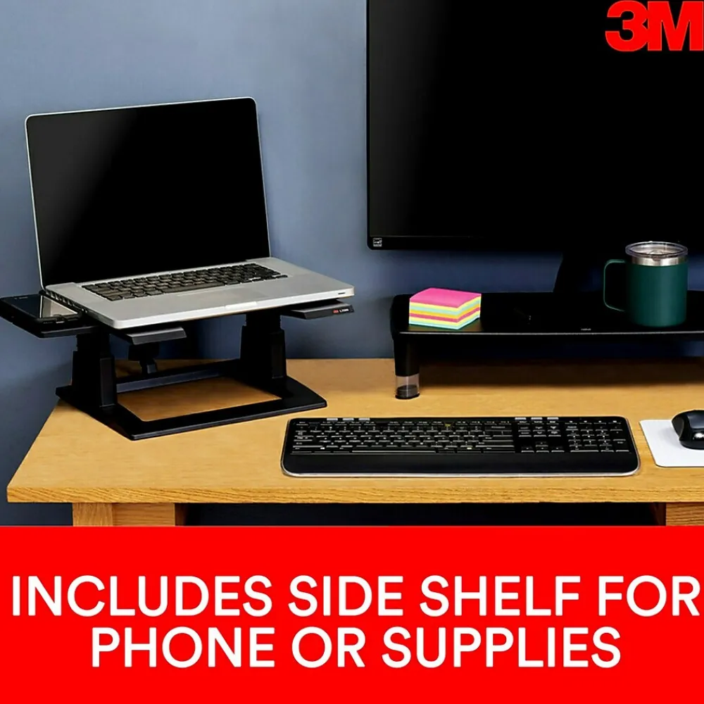 - Includes side shelves for accessories and an adapter for the 3M DH445 Document Holder (sold separately)