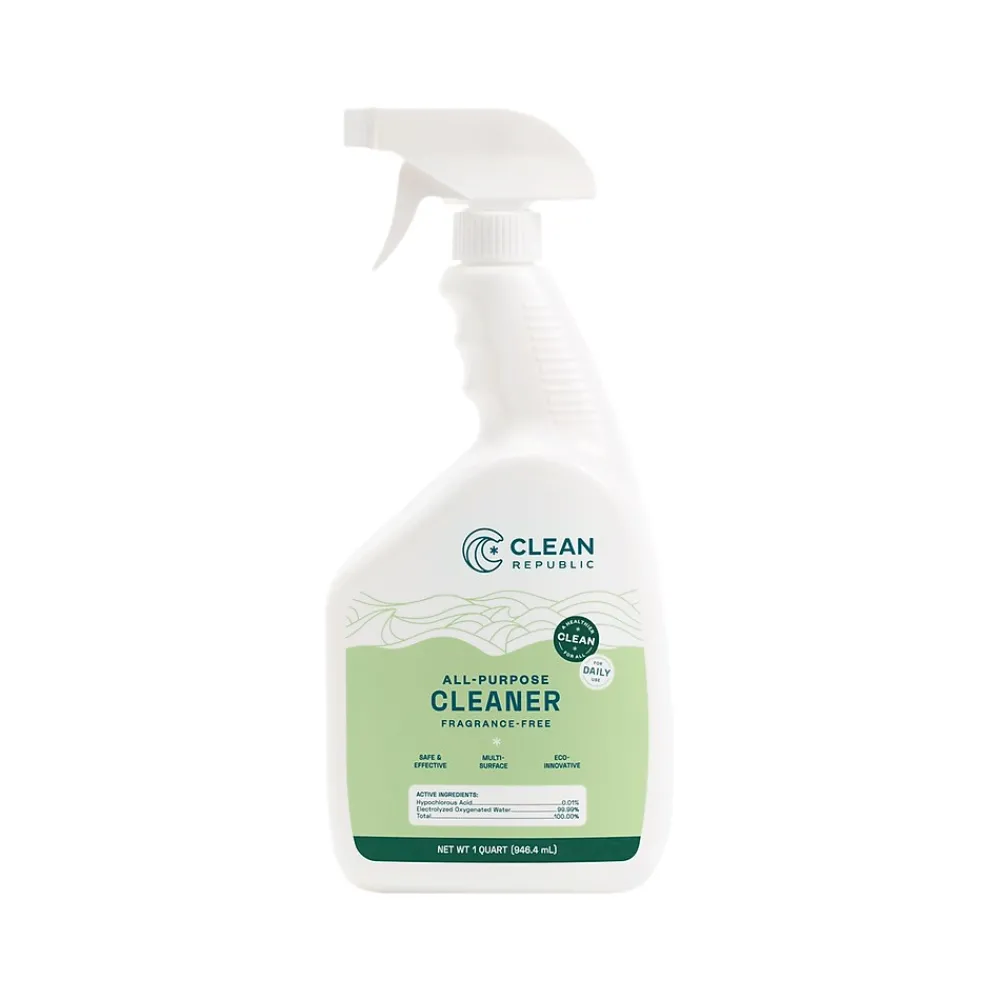 The Clean Republic all-purpose cleaner is fast-acting, effective, and ready to use. It harnesses the power of hypochlorous acid to remove germs, dirt, and impurities and is tailored for daily use in between deeper cleans when disinfection is not necessary. A multi-surface cleaner and deodorizer perfect for high-traffic areas.