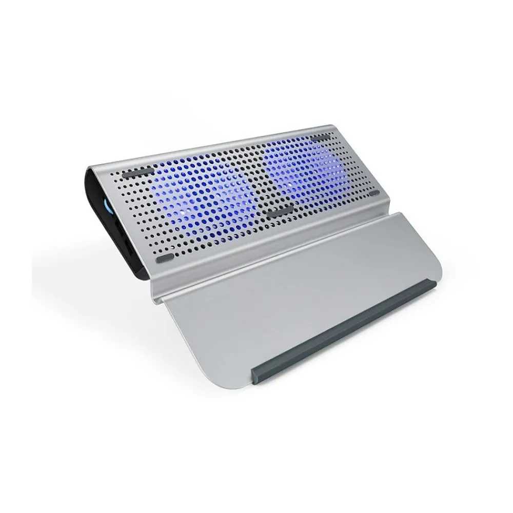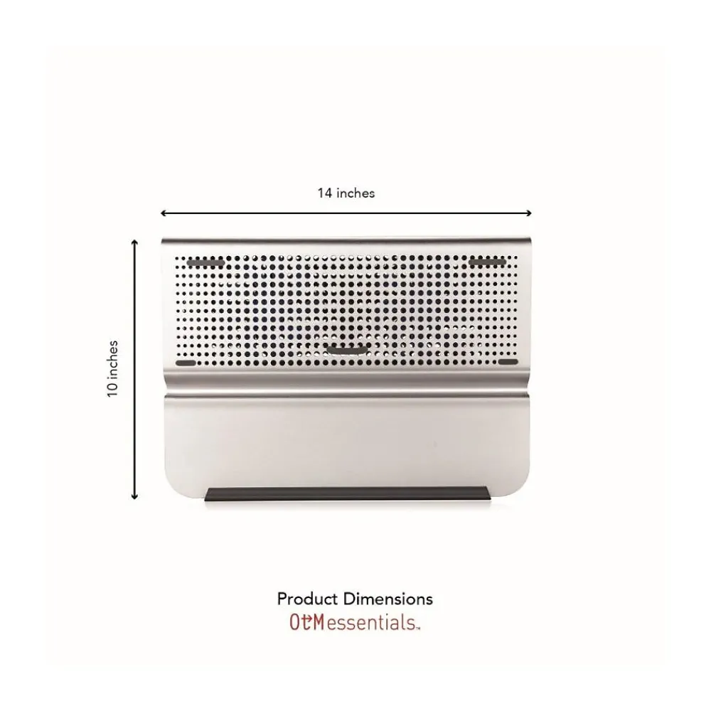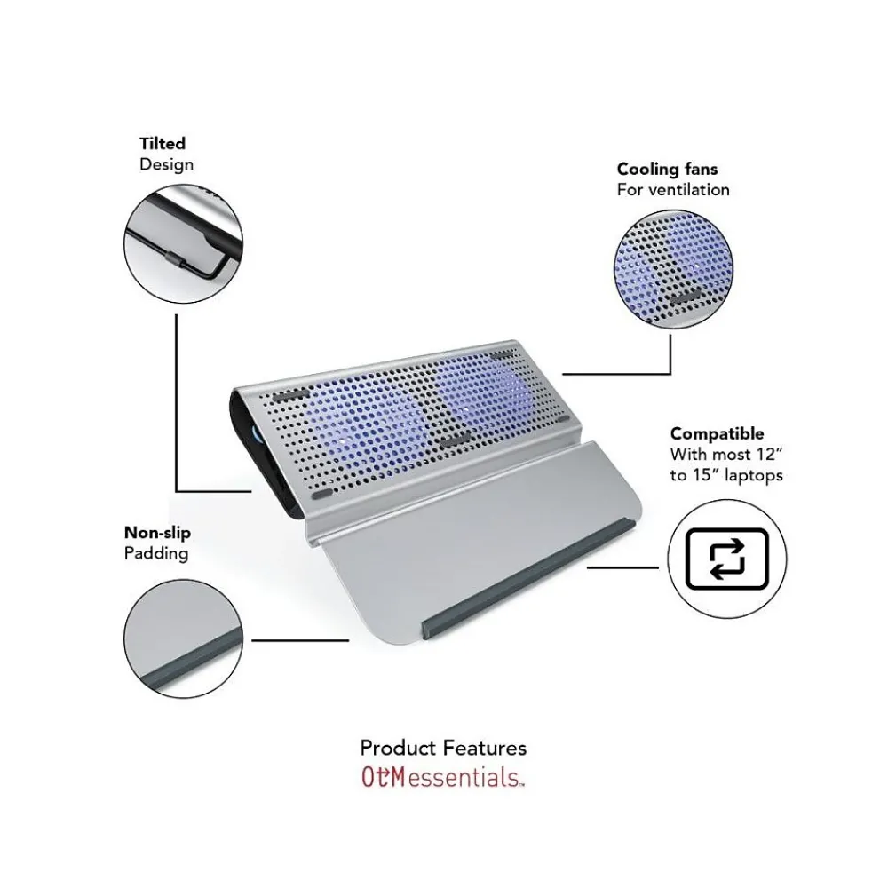 The OTM Essentials aluminum large laptop riser stand features nonslip padding to hold the laptop securely in place and cooling fans to help keep the laptop ventilated. Tilted design allows for maximum comfort. Great for 12″-15″ laptops.