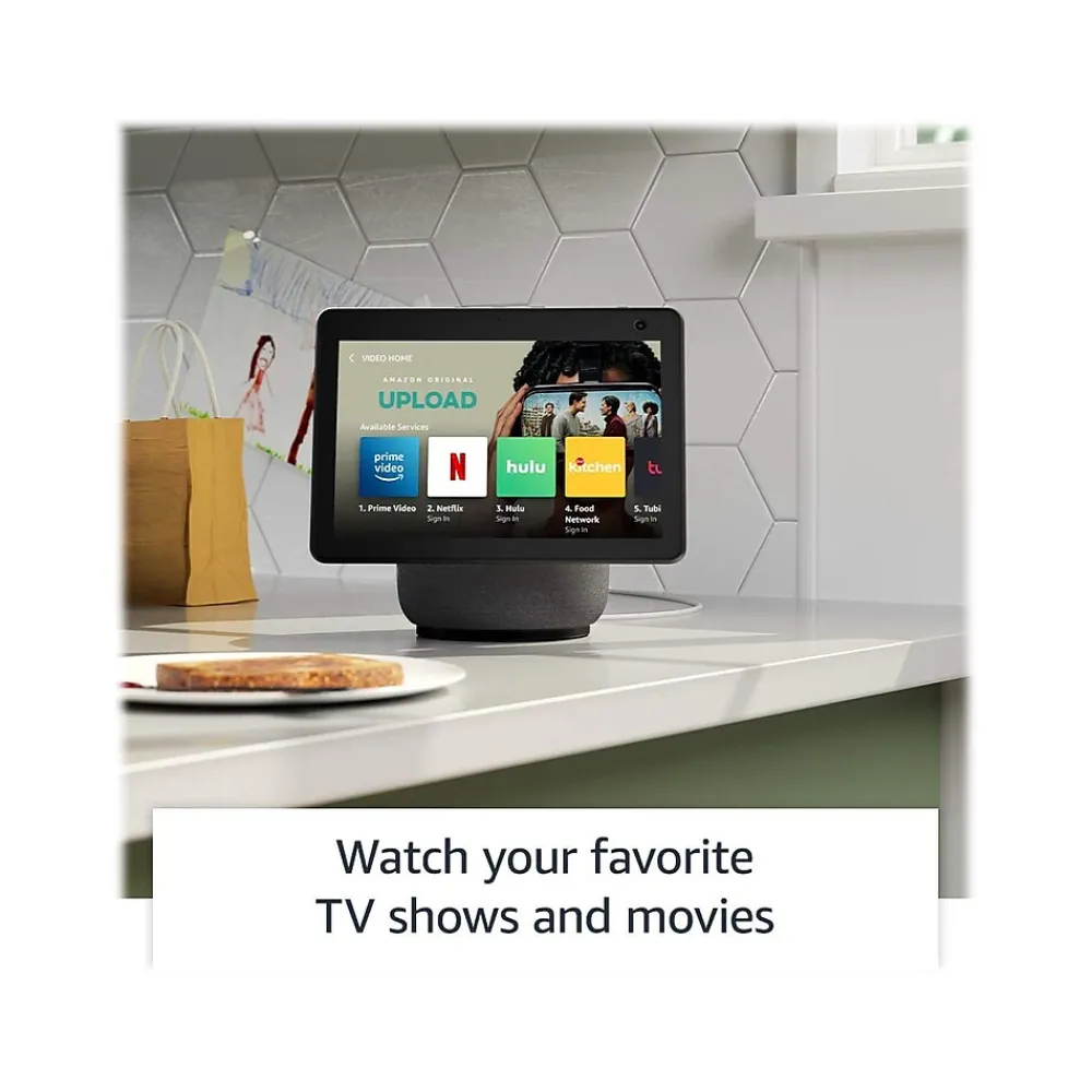 Meet the Amazon Echo Show 10 (3rd Gen) HD smart display with motion and Alexa. Move around the room during video calls or while you’re cooking along to a recipe, and the brilliant 10.1″ HD screen will automatically turn to face you. You can stay focused on who you’re talking to or what you’re watching. Alexa can control thousands of compatible smart home devices such as security cameras, lights, thermostats, and more. The speakers deliver premium, directional sound that adapts to the space you’re in. The HD screen brings your shows to life from Prime Video, Netflix, Hulu, and other favorites. It’s also perfect for catching up on the latest news and sports highlights. The Echo Show 10 (3rd Gen) is built with multiple layers of privacy controls, including a microphone/camera off button and a built-in shutter to cover the camera. Easily turn on/off motion at any time by voice, on device, or in the Alexa app.