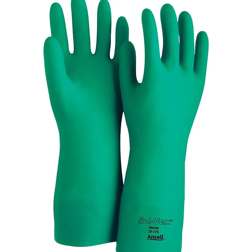 Ansell® Sol-Vex® Large 13″ long unsupported nitrile gloves in green color feature straight cuff and are chemical resistant. High-performance gloves can be used with aromatic or petroleum solvents and are ideal for industrial or warehouse works.
