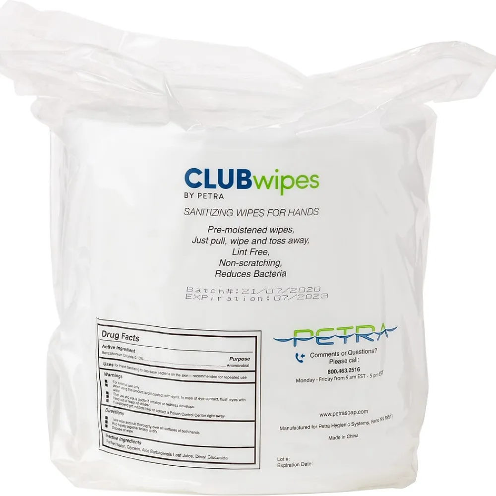 Petra CLUBwipes are antiseptic skin sanitizing wipes that kill harmful bacteria and germs. Each wipe contains benzalkonium chloride which acts as an active ingredient and is known to be effective in destroying harmful bacteria to provide antiseptic cleaning.