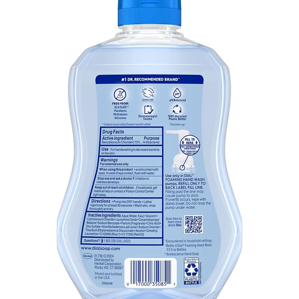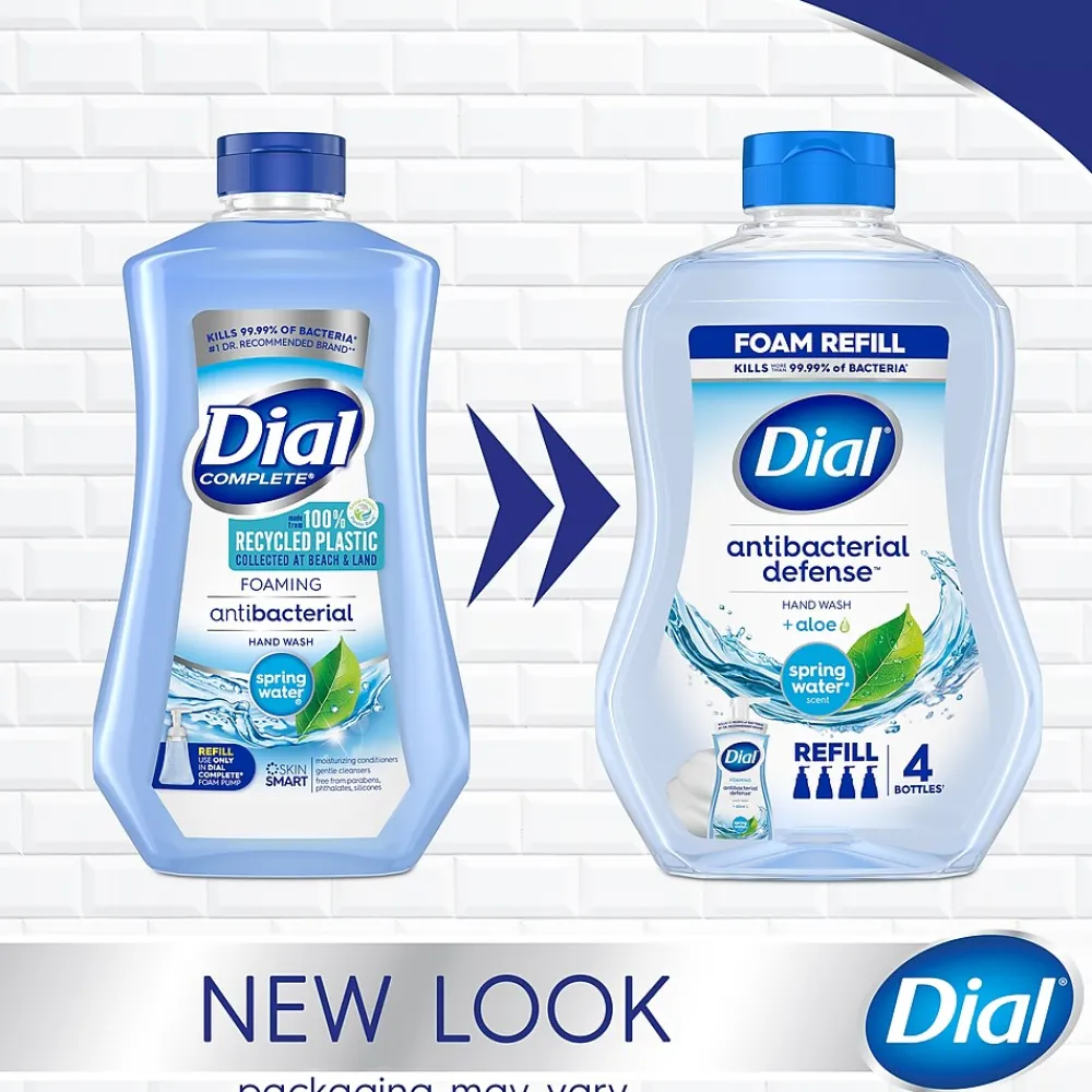 Enjoy the fresh scent of the Dial Antibacterial Defense Spring Water foaming hand wash. The formula contains aloe vera and kills more than 99.99% of bacteria while being gentle on skin, leaving it feeling soft, smooth, and healthy. Dermatologist-tested and approved as cruelty-free under the Leaping Bunny program. One refill bottle contains enough product to refill four Dial foaming hand wash bottles.