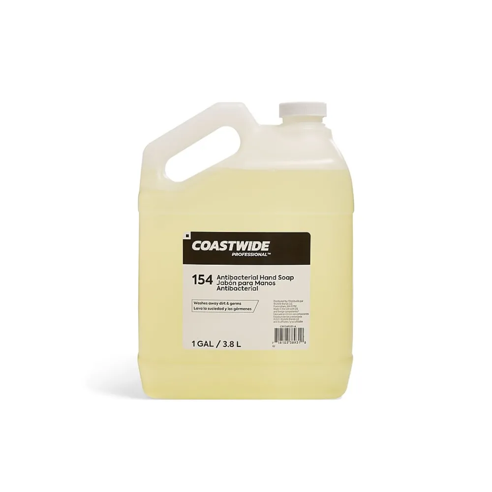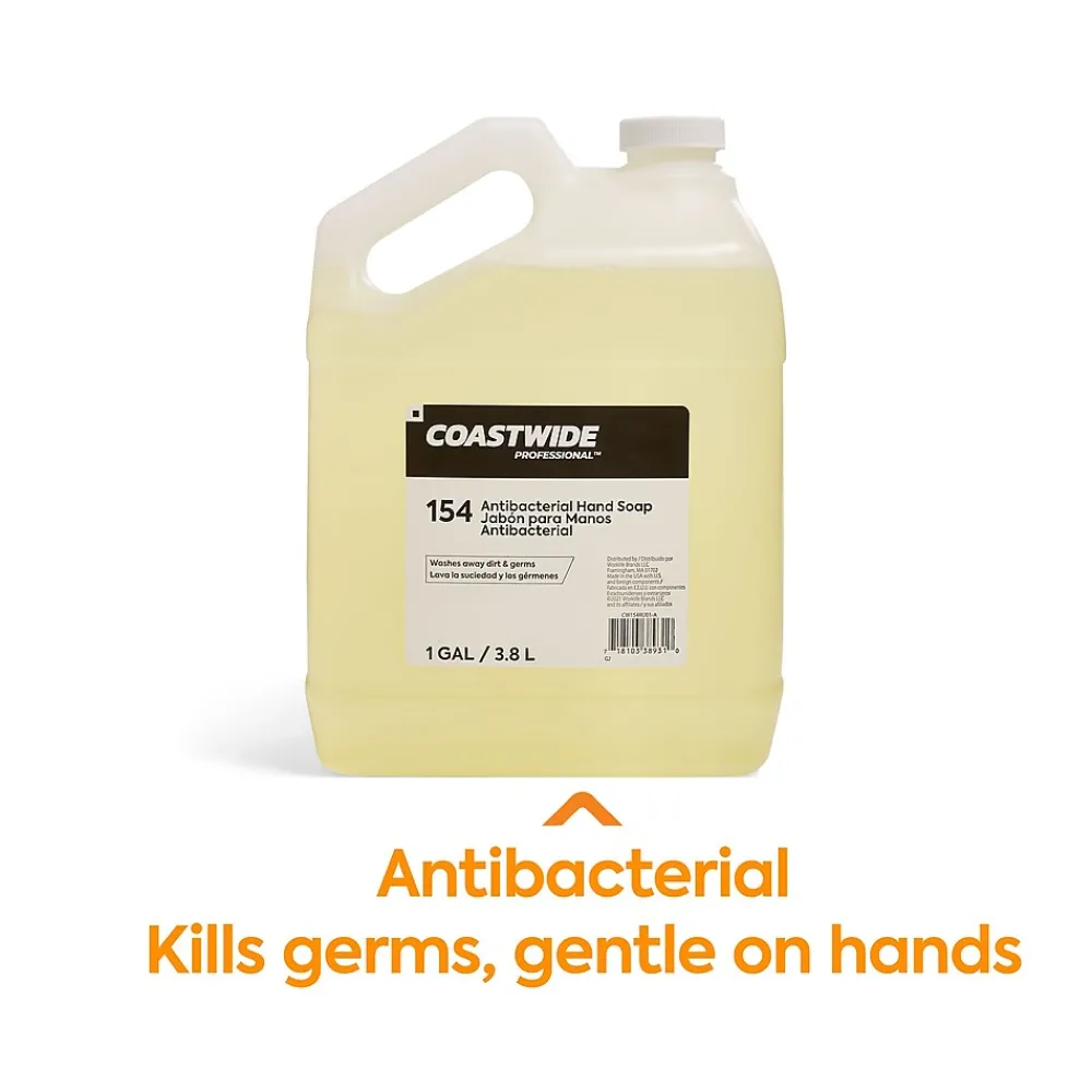 Kill germs with this 1-gallon refill jug of antibacterial hand soap. The formula contains a powerful antimicrobial that kills bacteria and viruses. This four-pack of Coastwide Professional antibacterial hand soap comes in sturdy 1 gallon bottles to prevent damage during storage and has a top grip handle to simplify dispensing.