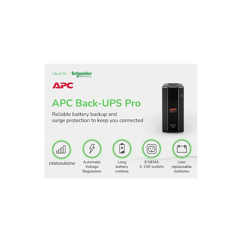 The APC Back-UPS Pro uninterruptible power supply provides power to your critical devices during an outage, allowing you to continue working or gaming and stay connected to your network. Perfect for PCs, home office electronics, networking devices, SmartHome devices, and gaming consoles.