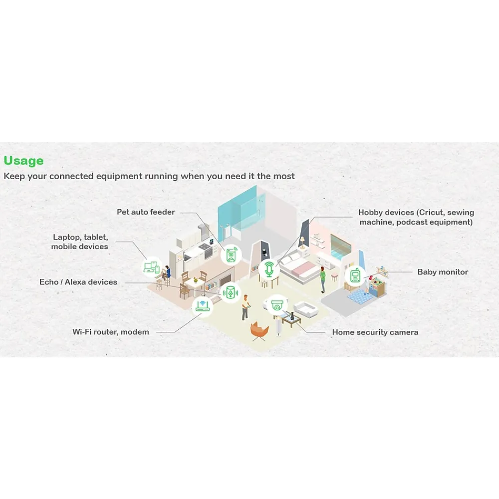 - 6 Outlets (NEMA 5-15R): 4 ups battery backup & surge protector outlets; 2 outlets with Surge Protection Only