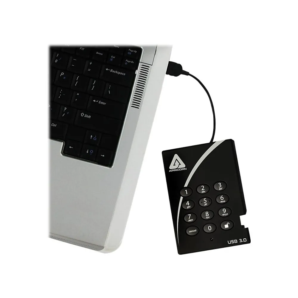 Protect confidential files with this external storage device. The drive has an arsenal of data security measures, including high-tech encryption and front-facing keypad authentication. With software-free setup and a compact size, the Apricorn Padlock 2TB hard drive is easy to use and even easier to store out of sight.