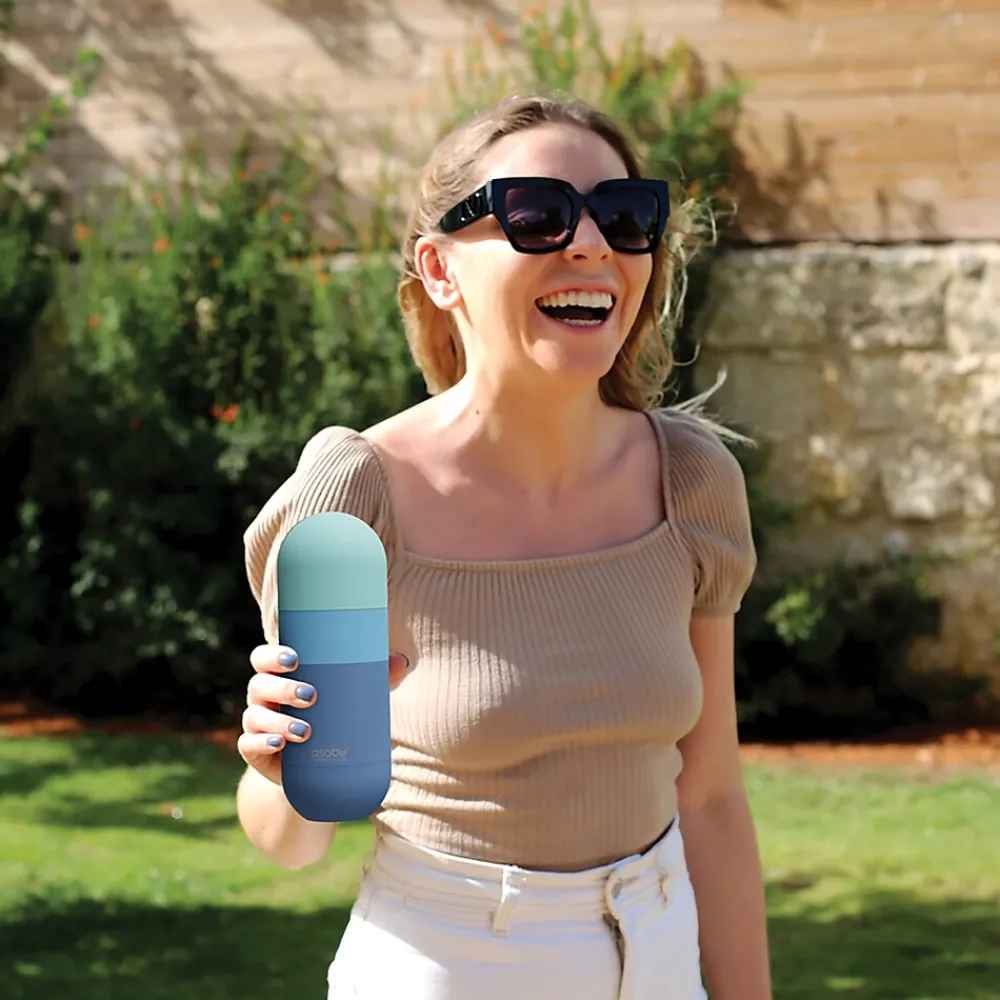 The ASOBU Pastel Blue 14-Oz. Orb Water Bottle is made of double-wall, vacuum-insulated, copper-lined stainless steel construction so it will keep your drinks hot or cold for hours. The ergonomic easy-grip shape makes it an ideal travel companion. And its stunning look sets you apart from the crowd of standard insulated bottles on the market today. The Orb bottle comes with a soft-touch exterior while the lid can be used as a handy cup for serving a small portion when preferred. Make a unique fashion statement today and the next time you are out and about during your busy day or evening with the Orb water bottle.