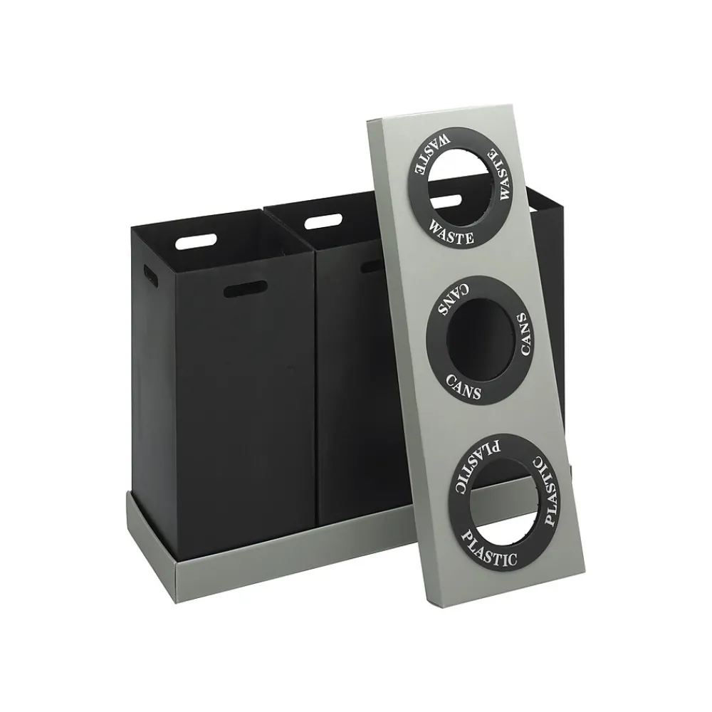 - Use included decals to label openings in a unified lid of this three-compartment trash can