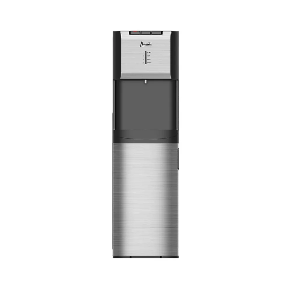 The Avanti bottom-loading water dispenser offers instant access to ice cold and piping hot purified water with the touch of a button. Enjoy a cool, refreshing glass of water or prepare your favorite hot or chilled beverages, soups, or oatmeal with ease. Bottled water is stored conveniently inside the cabinet so there’s no need for lifting, flipping, or spilling. The empty bottle indicator lets you know when it’s time for a new bottle of water. Its simple clean look complements the decor of nearly any room in your home and its child safety latch ensures peace of mind. This dispenser uses three- or five-gallon bottles, which reduce waste from single-serve bottles.