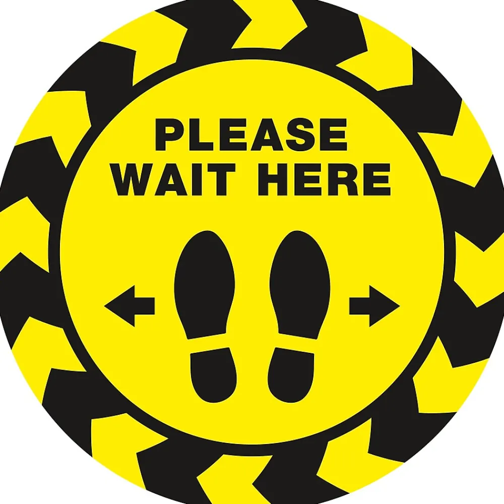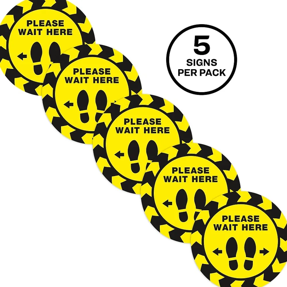 Keep people at a safe distance with round Avery “Please Wait Here” social distancing floor decals. Preprinted with an eye-catching yellow and black pattern and a semi-glossy finish, these large round “Please Wait Here” floor decals have a 10.5″ diameter and immediately stand out. Built to withstand the constant wear and tear of everyday foot traffic, these anti-slip vinyl floor decals are scuff resistant, water resistant and UV-coated for additional durability. Removable floor decals stick and stay to multiple indoor surfaces but also peel away cleanly. The removable adhesive also makes it easy to reposition the floor decals so that you can carefully adjust the placement of the vinyl floor decals to make sure that the spacing is just right. Preprinted social distancing floor decals are perfect for every type of location or business including retail stores, restaurants, hair salons, banks, airports and more. Includes 5 preprinted removable vinyl decals.