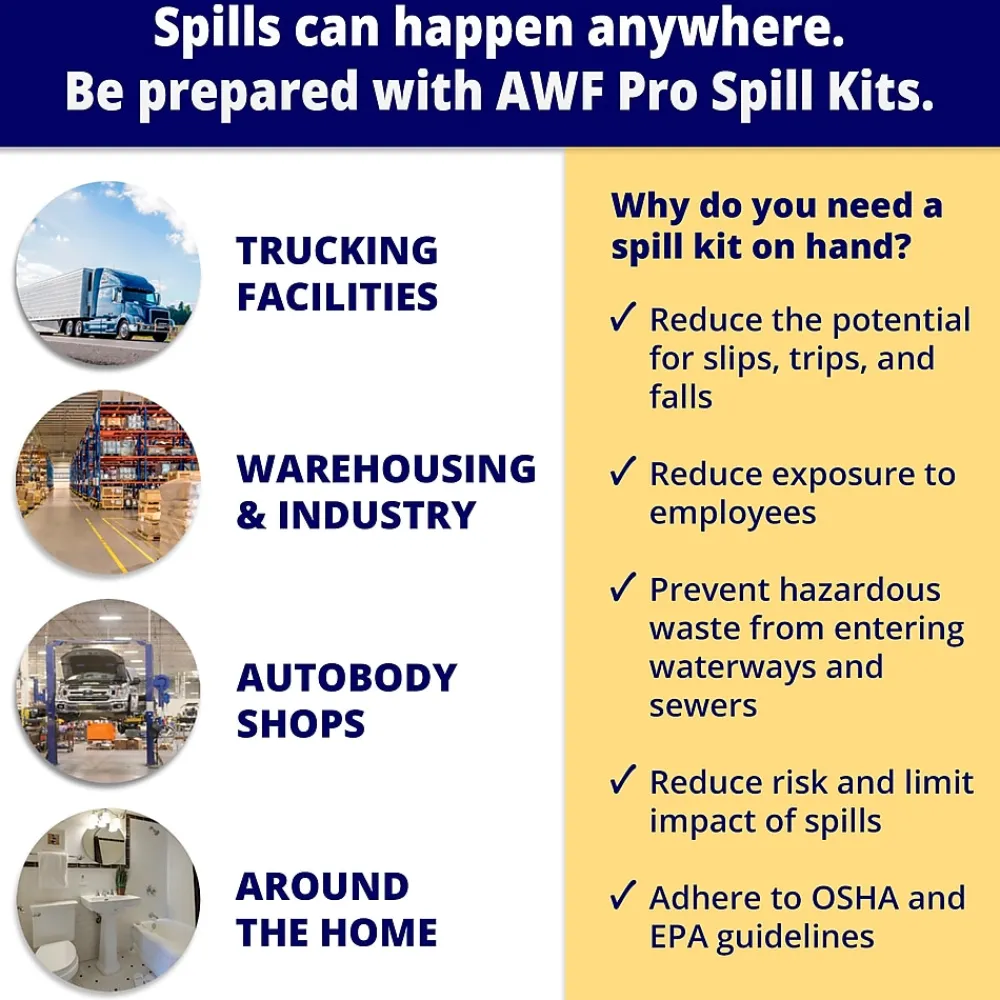 - SPILL CONTROL – Spills are inevitable despite our best efforts. Be prepared for the worst with the AWF PRO Spill Kit. AWF PRO Spill Kit comes packed with everything needed to contain and absorb spills. The mix of sorbent pads, socks and pillows give you the tools to reduce spill spread and contamination. With AWF PRO, you get more for less!