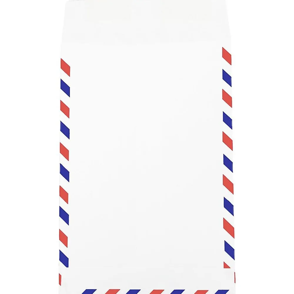 JAM PaperĀ® Airmail 6 x 9 Open End Envelopes are a fun and sophisticate choice for many kinds of documents and item mailings! These 6 x 9 inch envelopes are white and feature a red and blue slanted stripe border in the style of vintage stationery. On the front of each one on the right side, there is a red, white, and blue winged emblem that reads “Via Air Mail” in English, Spanish, and French. These straight flap open end envelopes open on the short end and feature reliable gum closures to keep mailed items secure in transport. This pack contains an even total of 50 envelopes for multiple home or office mailing purposes!