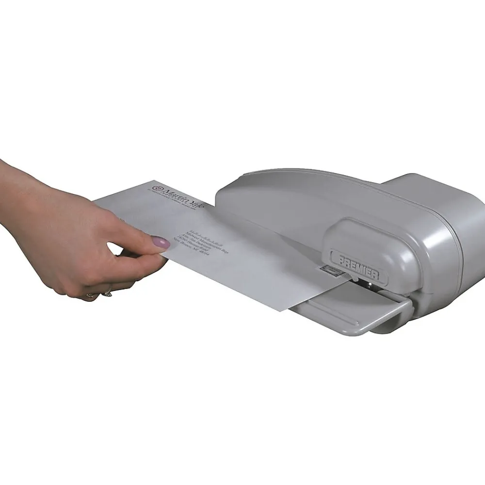 Outfit your office with this electric letter opener that automatically opens inserted letters with its fully enclosed blades. This Martin Yale electric letter opener has automatic on/off design and is intended for use with #9 and #10 envelopes for versatile function.