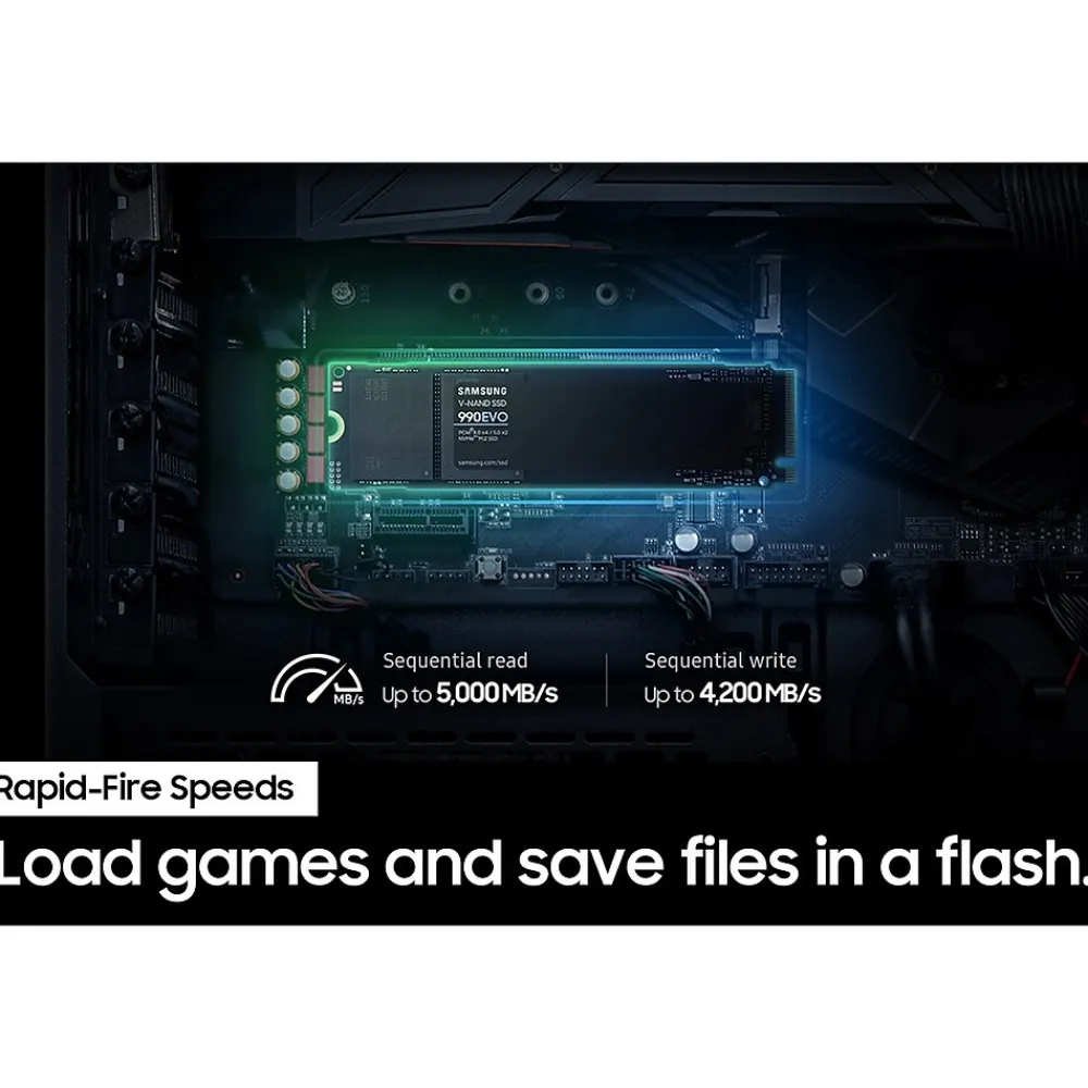 Give every task a boost. Load games and save files in a flash. Bring power to your productivity with read and write speeds of up to 5000/4200 MB/s. The Samsung 990 EVO provides continuous speed to keep you going. Save the power for your performance. Get power efficiency all while experiencing up to 70% improved performance per watt over the 970 EVO Plus. It makes every move more effective with less power consumption overall. Now you can ramp things up without overheating the system. Samsung’s fine-tuned controller and heat-spreading label deliver effective thermal control to avoid sudden performance drop mid-project. It cools things down even when things are running high, so your hard-earned checkpoints are saved. Optimized to support the latest technology for SSDs, Samsung 990 EVO is compatible with PCIe 4.0 x4 and PCIe 5.0 x2. This means you get more bandwidth and higher data processing and performance.