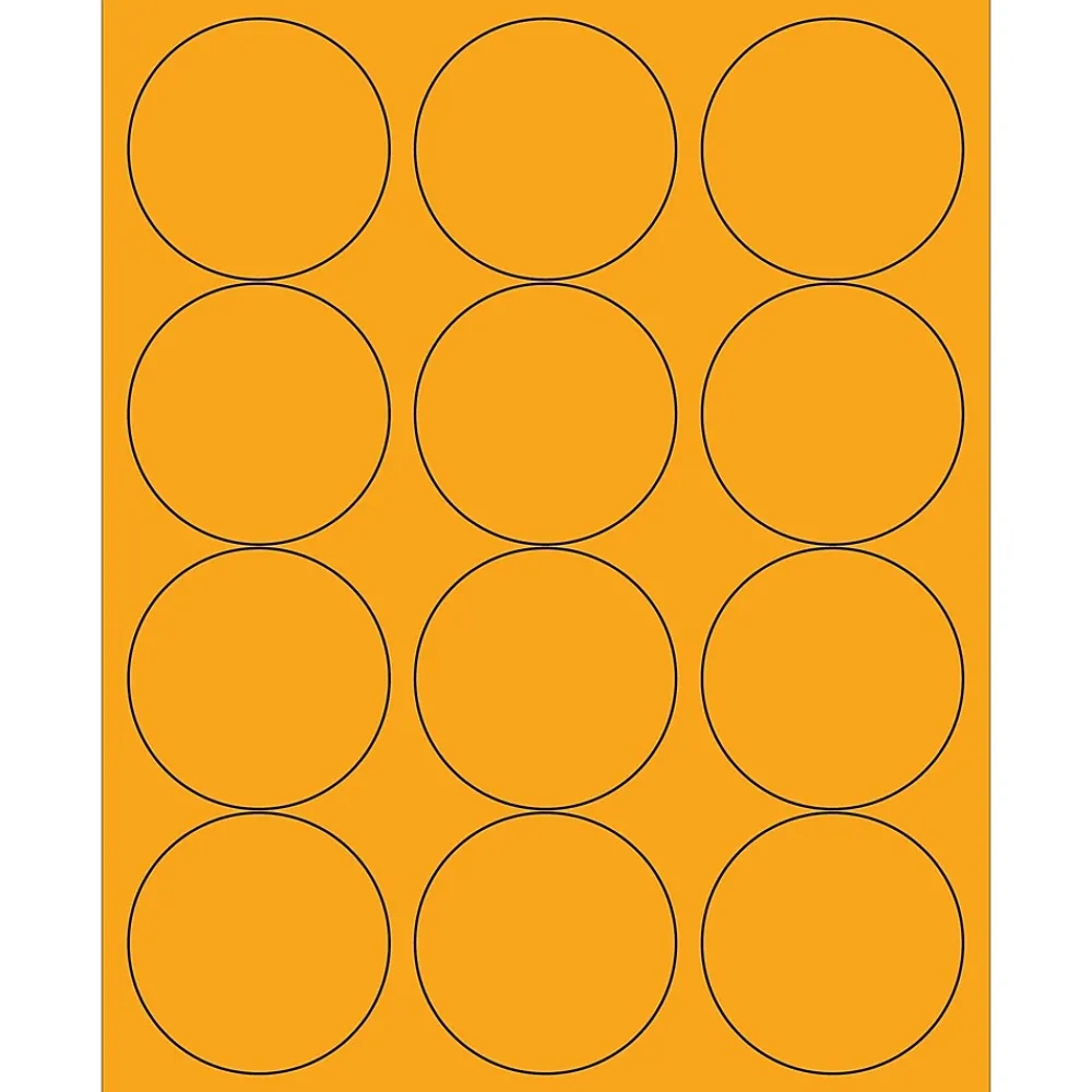 2 1/2″ Fluorescent Orange Circle Laser Labels. Use to create your own product or mailing labels. Labels work with both Laser and ink jet printers. Permanent adhesive. Labels stick to a variety of smooth surfaces including paper, corrugated, plastic, wood, glass and metal.